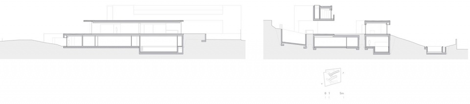 功能组织顺应这种上升逻辑展开:底层布置游泳池与客房;中层为面向湖景展开的公共起居空间;最高层则集中夜间功能,形成一条“桥”式体量,其下方生成宽阔而连续的遮阴露台。不同体量的交汇处设置交通核心,不仅串联起各层空间,也进一步强化了建筑与地形、景观之间的连续关系。