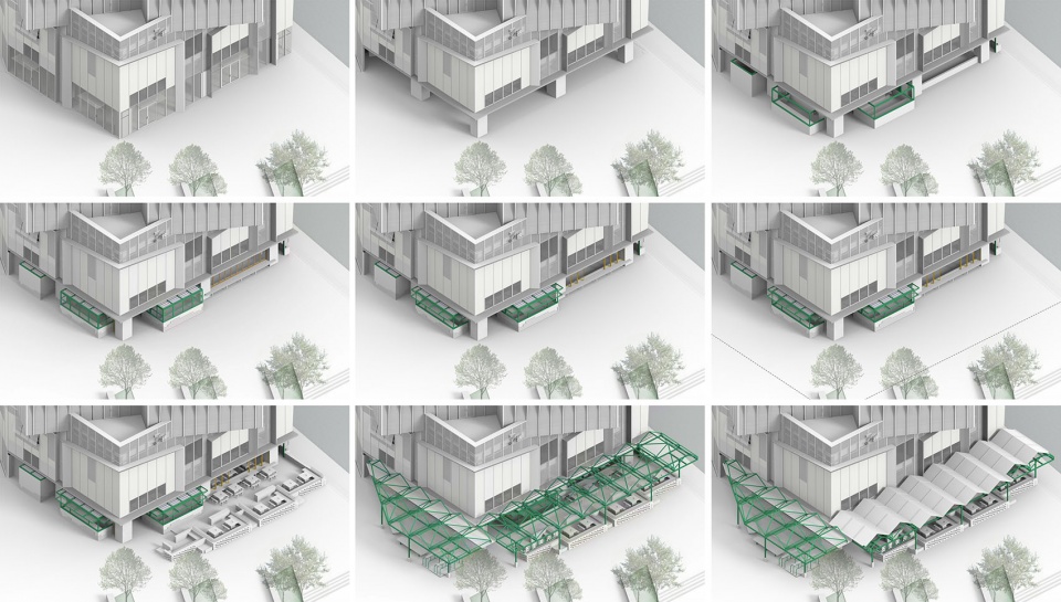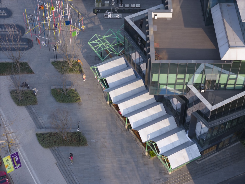 我们采用“搭棚棚的大排档”作为设计意向,想要以此唤起对市井氛围的场所记忆。小尺度连续折叠的三角形伞棚,与大体量堆叠的建筑体形成对话,体量和尺度的压缩,带来更近人的感受。室外构筑物分为有顶和无顶两部分空间。有顶空间立面开敞,夏冬两季增设临时塑料围挡作为气候分隔。无顶空间各面都开敞,是场所限定的框架构筑物,荷载设计上考虑了加建屋面板的余量,根据未来的发展可灵活搭设。采用型材搭接使得构筑具有“临时”物的气质,有顶和无顶的两组构筑物之间产生对话,给人架子还在搭建中的“未完成”印象,传达出市井中即兴、松弛的节奏。