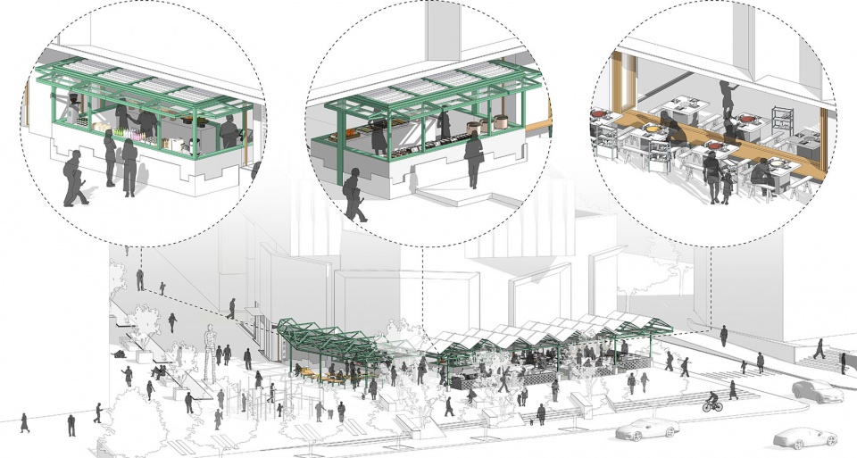 ▼沿街近人尺度的伞棚,Street-facing human-scale canopies