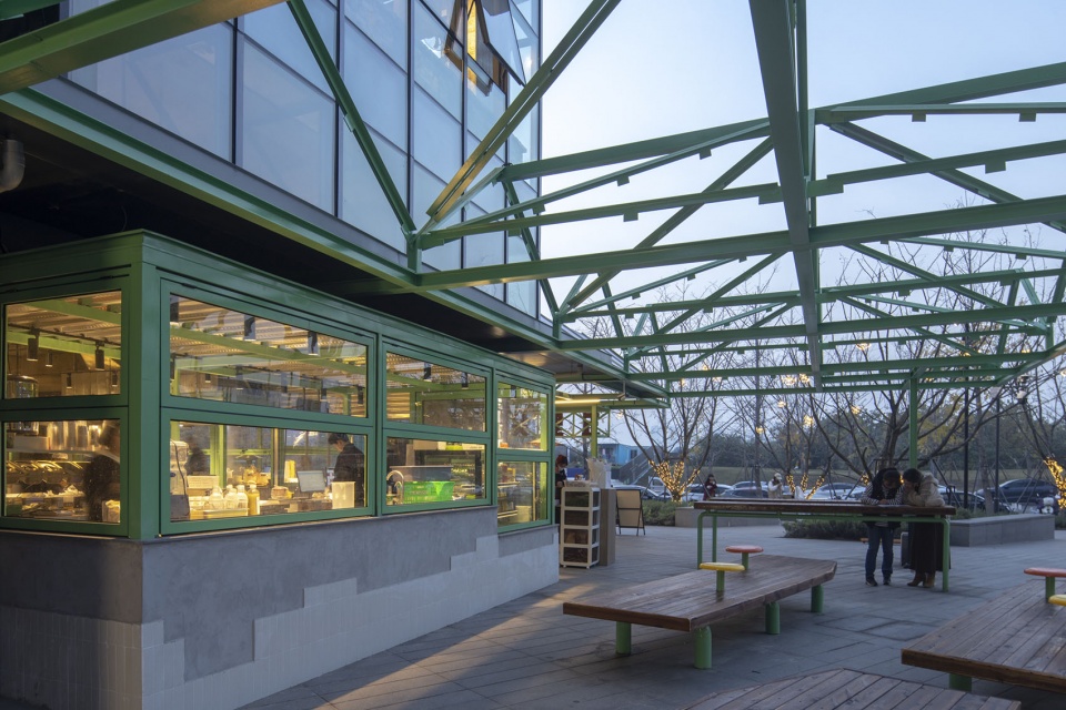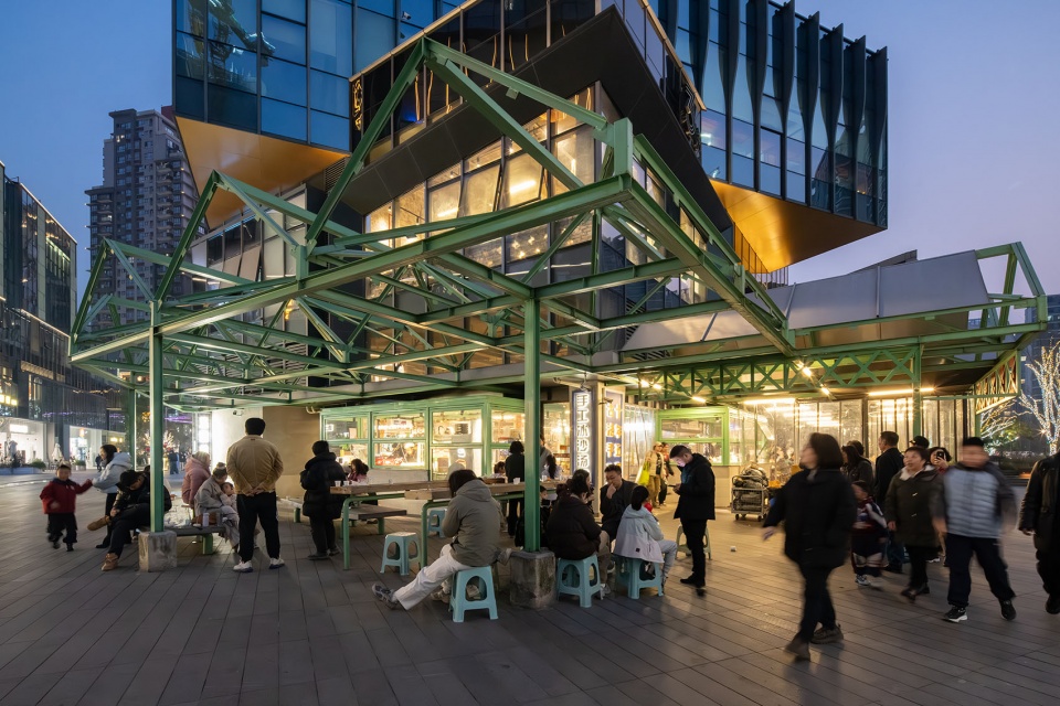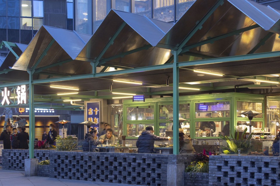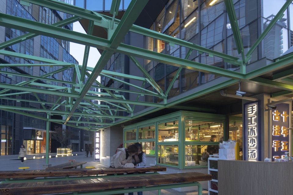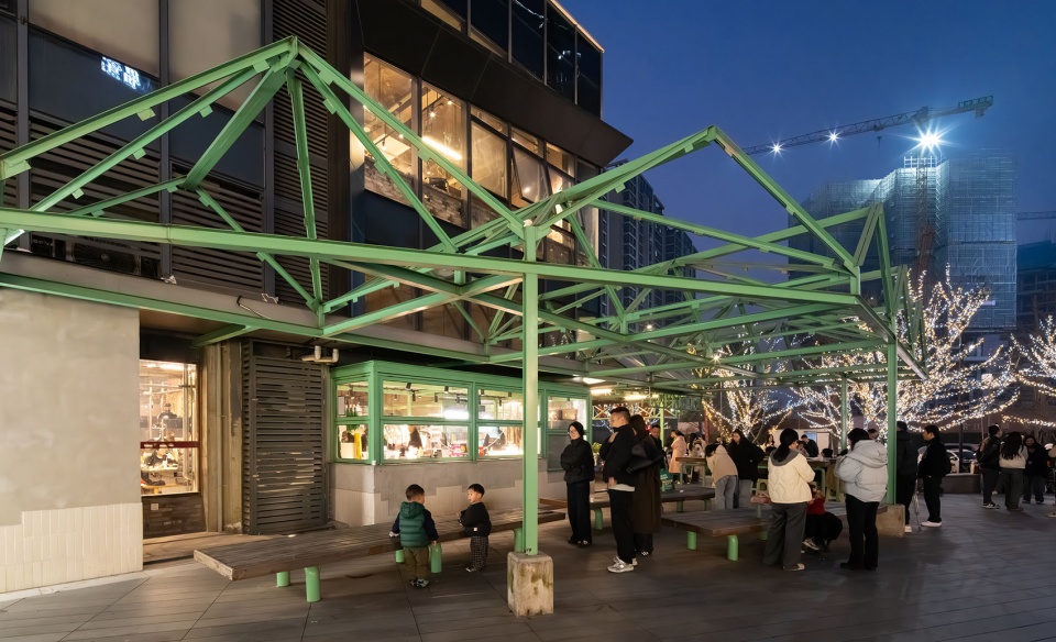New urban districts and streets are often tidy, bright, and refined, but in shedding the spontaneous, disordered, and mixed qualities of street life—thus losing some vitality of daily life.. This outcome may be an inevitable part of urbanization, but it is not necessarily the choice of grassroots daily life. Through designing the outdoor seating area, we aimed to create a compatible and flexible space within limited conditions, adding a breathable interface to the commercial complex and forming an engaging urban vignette.
