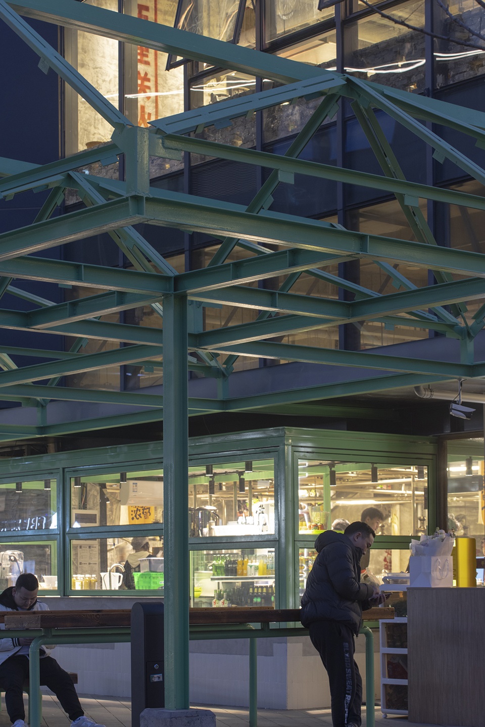 伞棚采用型材制作骨架,包括H型钢和角铁,屋面采用镀锌铁板敷设。所采用的型材相比矩管而言,视觉上更加轻巧。构造上参考传统厂房大空间常用的“轻型屋面三角形钢屋架”,据此基本构成进行深化设计,有色油漆喷涂下的传统建构方式,或许能够令人产生记忆闪回,去响应项目设计之初,商家关于经营场所风貌方面的展望。