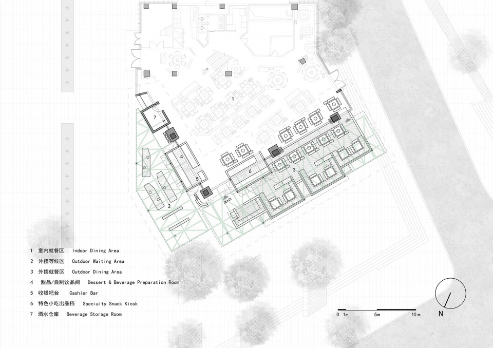 The boundary of the outdoor seating area is offset from the building’s main facade, ensuring close integration with the site. Its size is determined based on projected foot traffic to accommodate waiting and dining during peak hours. The waiting area merges with the street, allowing dynamic pedestrian flow to intersect with static waiting customers—creating a bustling, market-like atmosphere. The waiting area is divided into three zones: an open bench seating area at one end, an open standing table area in the middle, and a semi-enclosed booth waiting area near the entrance and outdoor dining zone. Different outdoor furniture configurations—loose seats, standing counters, and booths—cater to diverse behavioral patterns and customer groups: booths are prioritized for families with elderly members and children, loose seats for customers with longer wait times, and standing counters for those waiting briefly or approaching their turn. These varied configurations enrich the activity scenarios, making waiting less monotonous and passive. The outdoor dining area is located in a covered, semi-enclosed space with a partial facade. We made two subtle adjustments to its layout: 1) Six outdoor tables were rotated to align orthogonally with the building boundary, converting the original 4-seat tables into 6-8-seat semi-booths to enhance operational flexibility; 2) The original building curtain wall boundary was opened up to create a transitional indoor-outdoor dining area, with full-length folding windows serving as flexible dividers. This connects the indoor and outdoor operational spaces, forming a more cohesive open-air stall scene.