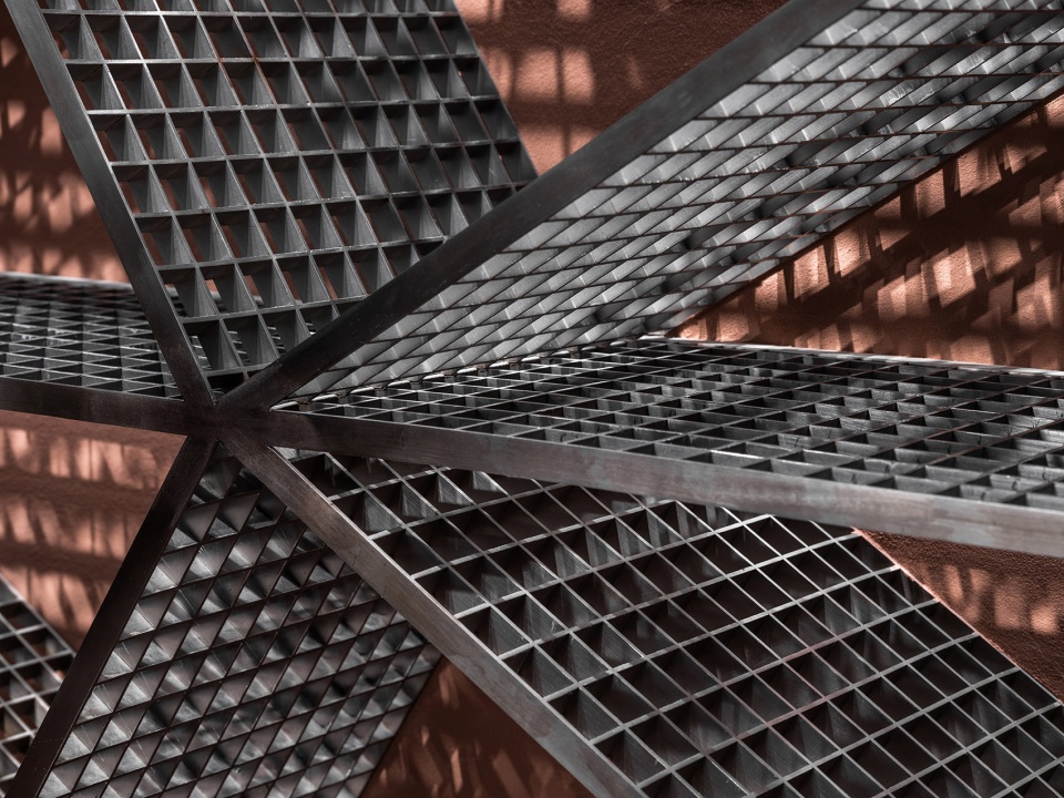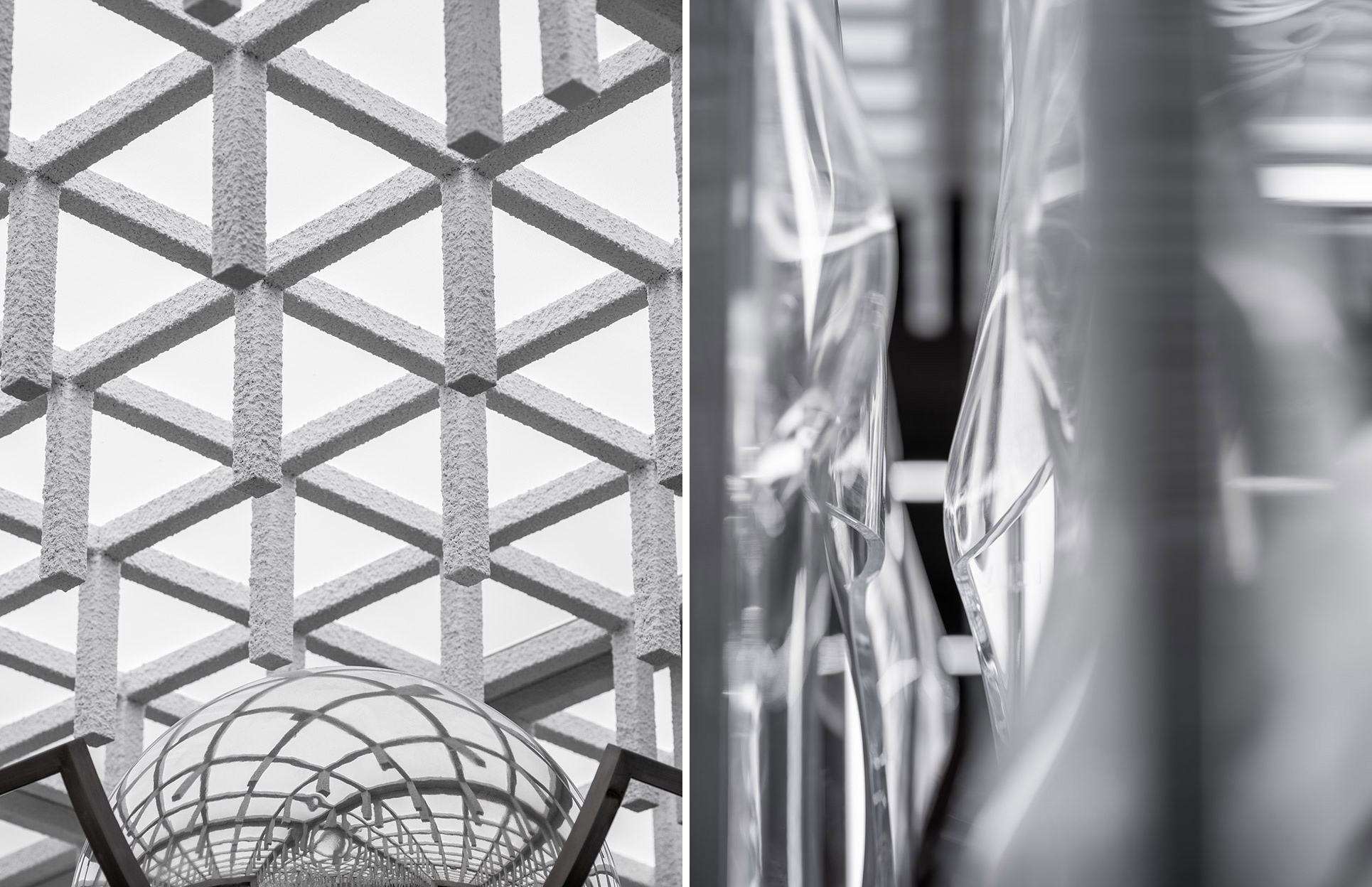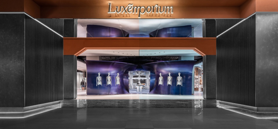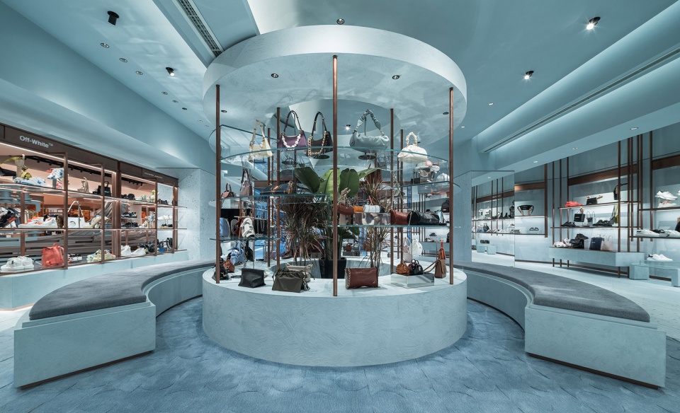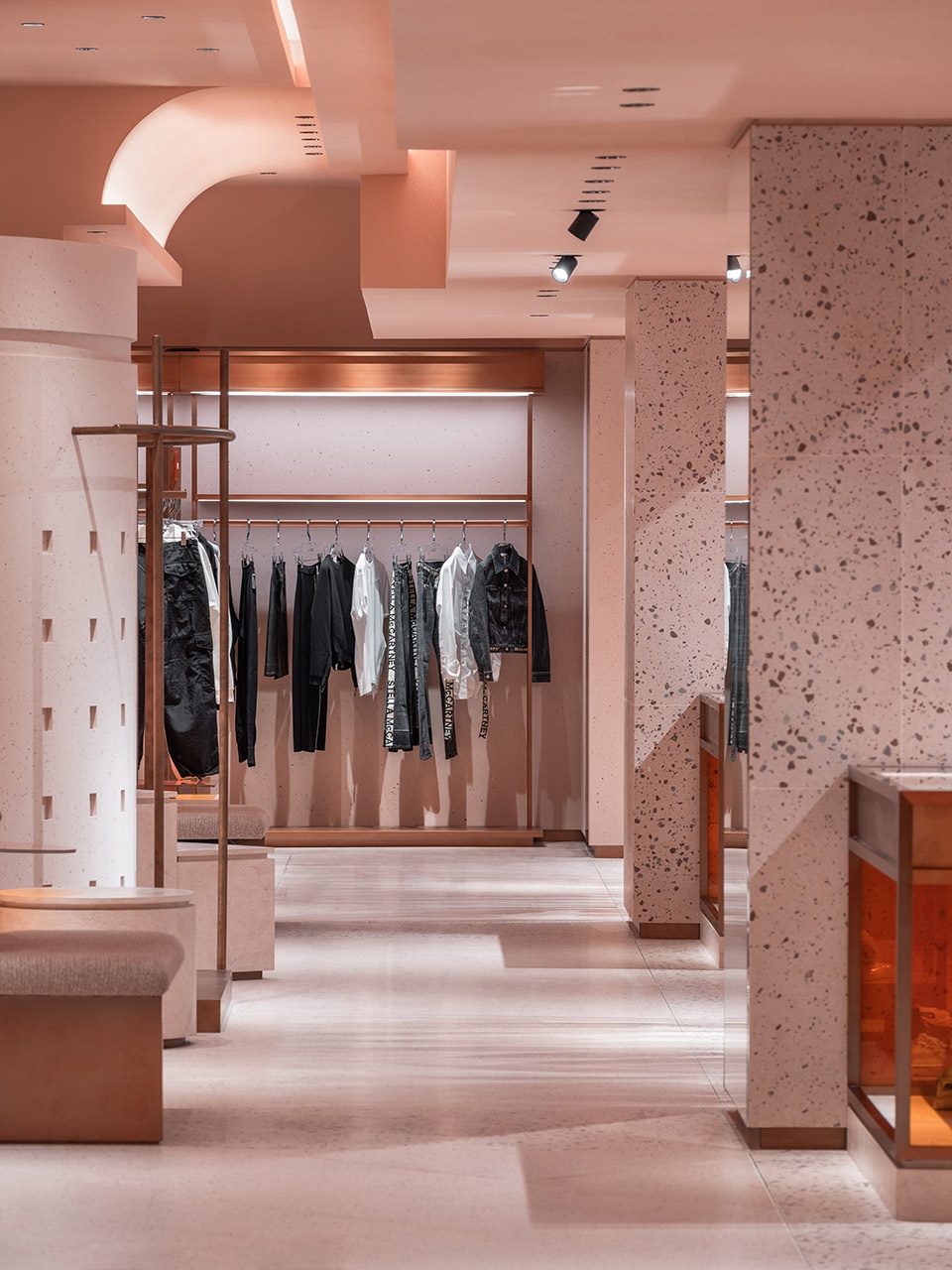 我们从装置的概念继续延展,将平行世界进行更深层次的分区规划,定义了四重平行空间:纬度平行,材质与颜色的平行,记忆平行以及镜面平行,将四个空间的语汇融入到服装,鞋包,配饰,潮鞋等不同的空间里。入口部分:从下至上的平行,从主入口可以看到金属柱面与陶土门头的材质和颜色碰撞。