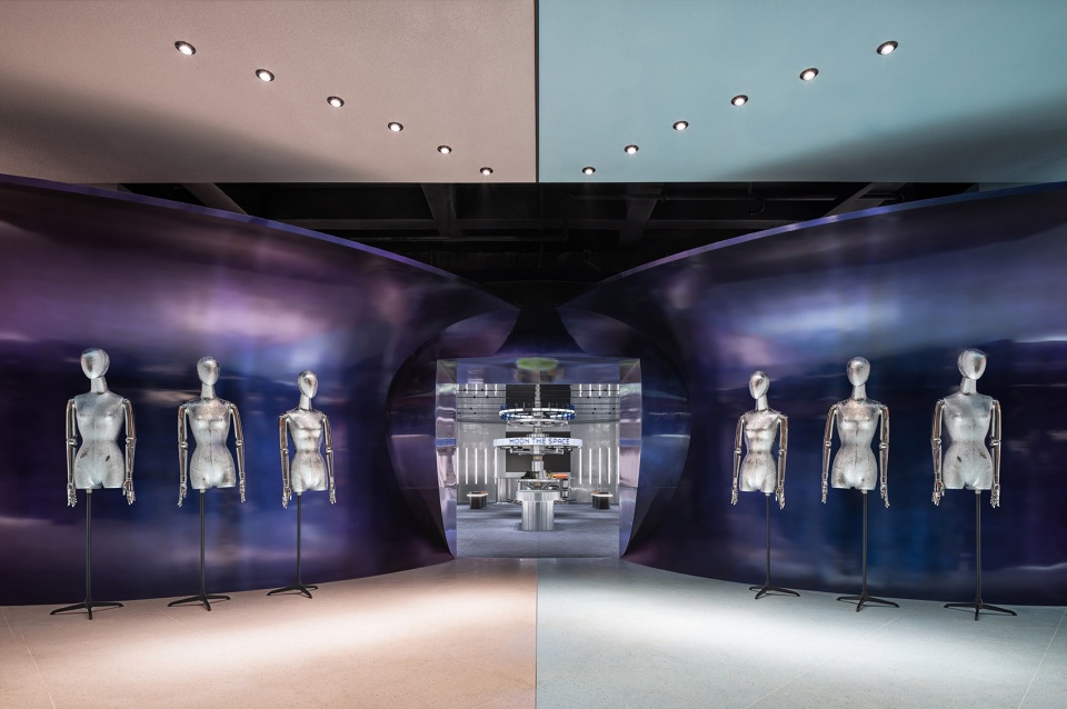 We imagined the spacecraft as a singular entry experience. The first identification space is the transfer station in the parallel universe where dedicated to retail limited collaborated shoes. Leading from the “transfer station”, the tunnel links to other spaces. Moon The Space elaborates the possibility of reality and vitality by taking the advantage of mirroring, offering a unique, immersive, and mysterious space.