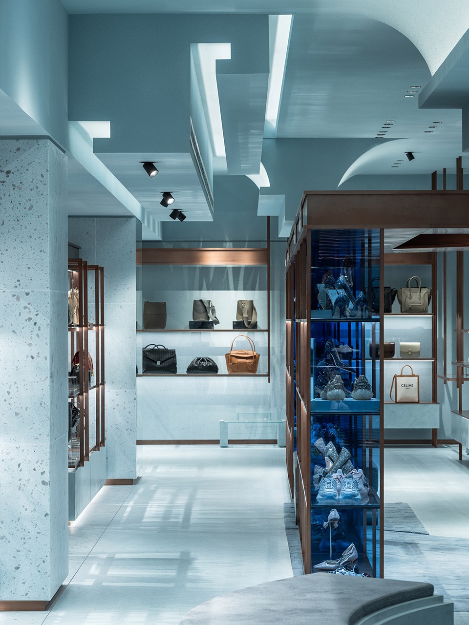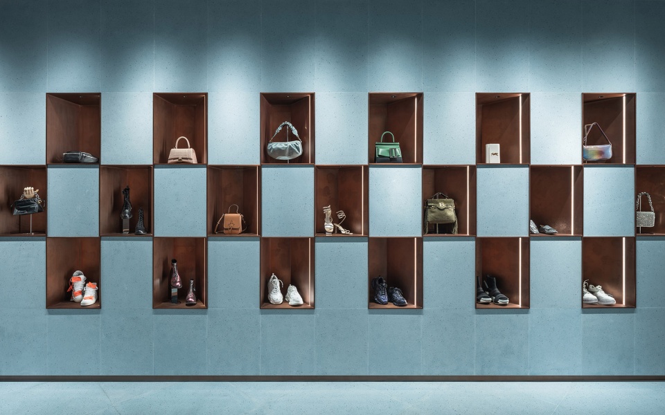 进门的右手边蓝色区域主要陈列Top20明星鞋包。我们想要表达记忆上的平行,作为这个设计的开端,意欲透过人们习惯上的记忆,提取记忆中信箱墙的型态,颜色与比例。
