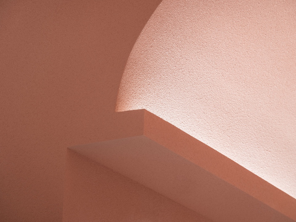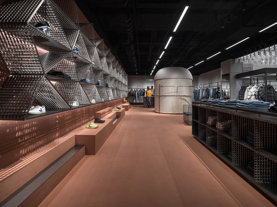 牛仔区域使人联想到西部牛仔,因此从地上到墙面长出陶土色的地貌,这种色系与牛仔的颜色搭配极为协调。