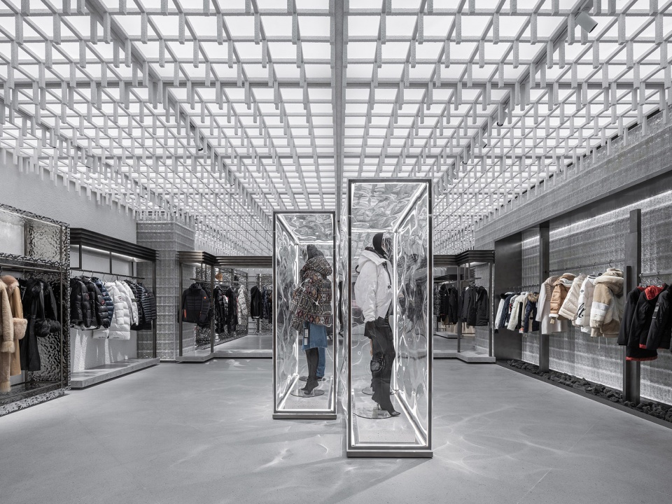 Digital snow was used to spread across walls and ceilings in the down jacket area, accompanying the decoration in the middle – South Pole detector, which also serves as a display function. The display shelves took the advantage of ice cubes to dedicate a sense of “cold”, immersing in the shopping atmosphere.