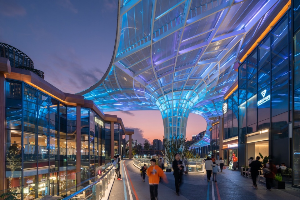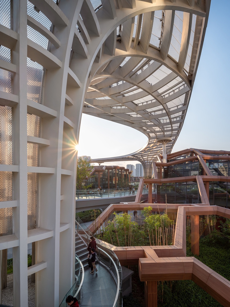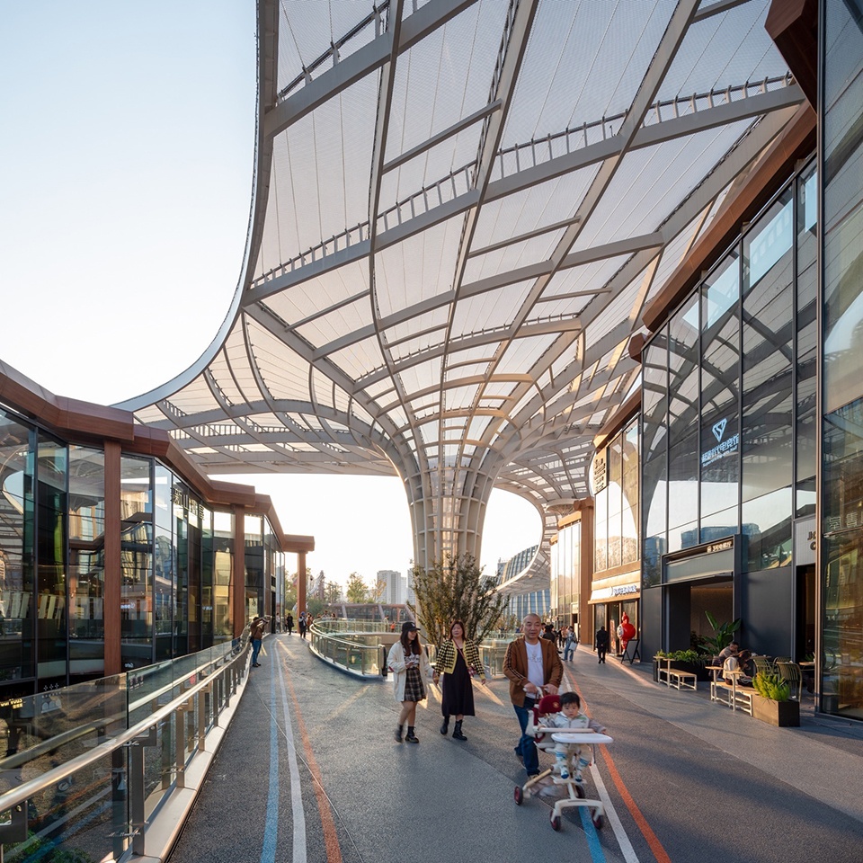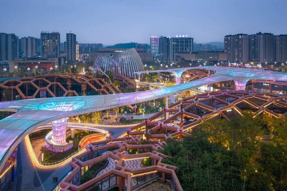 The project’s sustainability strategies include facade systems that incorporate fresh-air ventilation, rain canopies, and abundant daylighting with low solar heat gain, along with living roofs throughout the development. Several retail buildings use the first planar truss structure consisting of reconstituted bamboo in Sichuan Province.