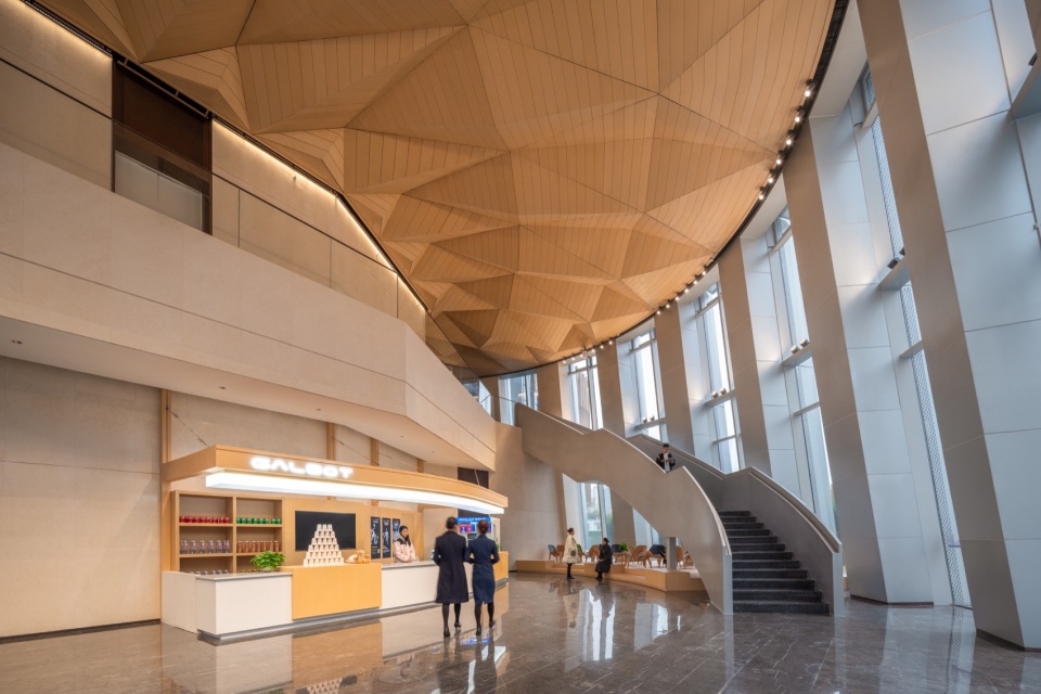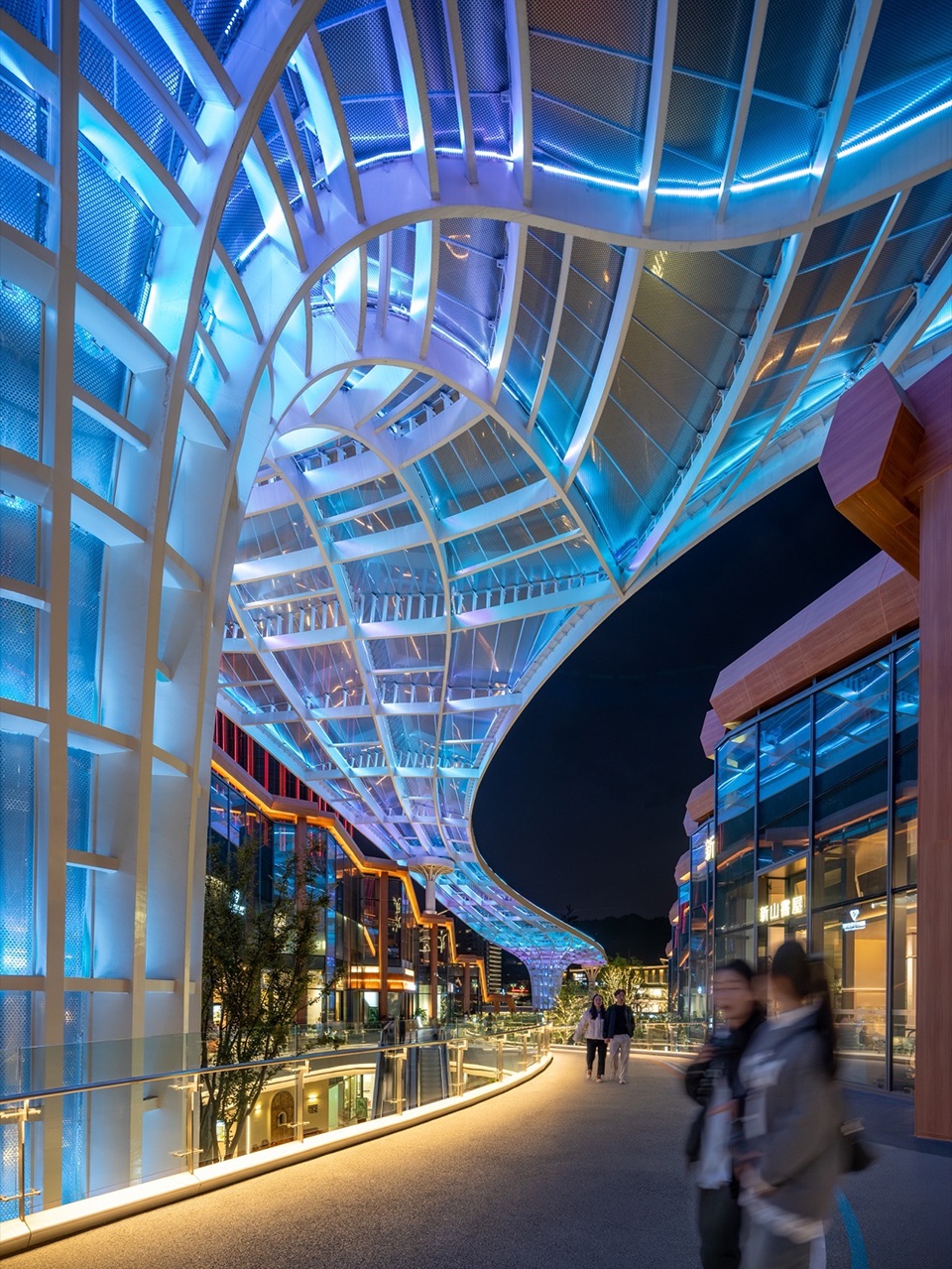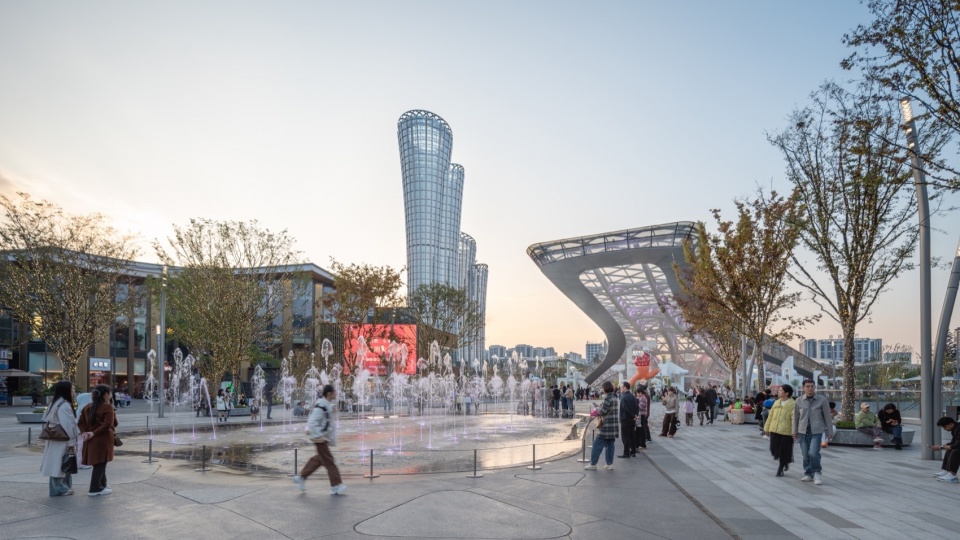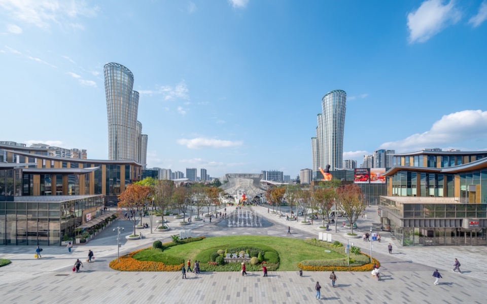 The project’s sustainability strategies include facade systems that incorporate fresh-air ventilation, rain canopies, and abundant daylighting with low solar heat gain, along with living roofs throughout the development. Several retail buildings use the first planar truss structure consisting of reconstituted bamboo in Sichuan Province.