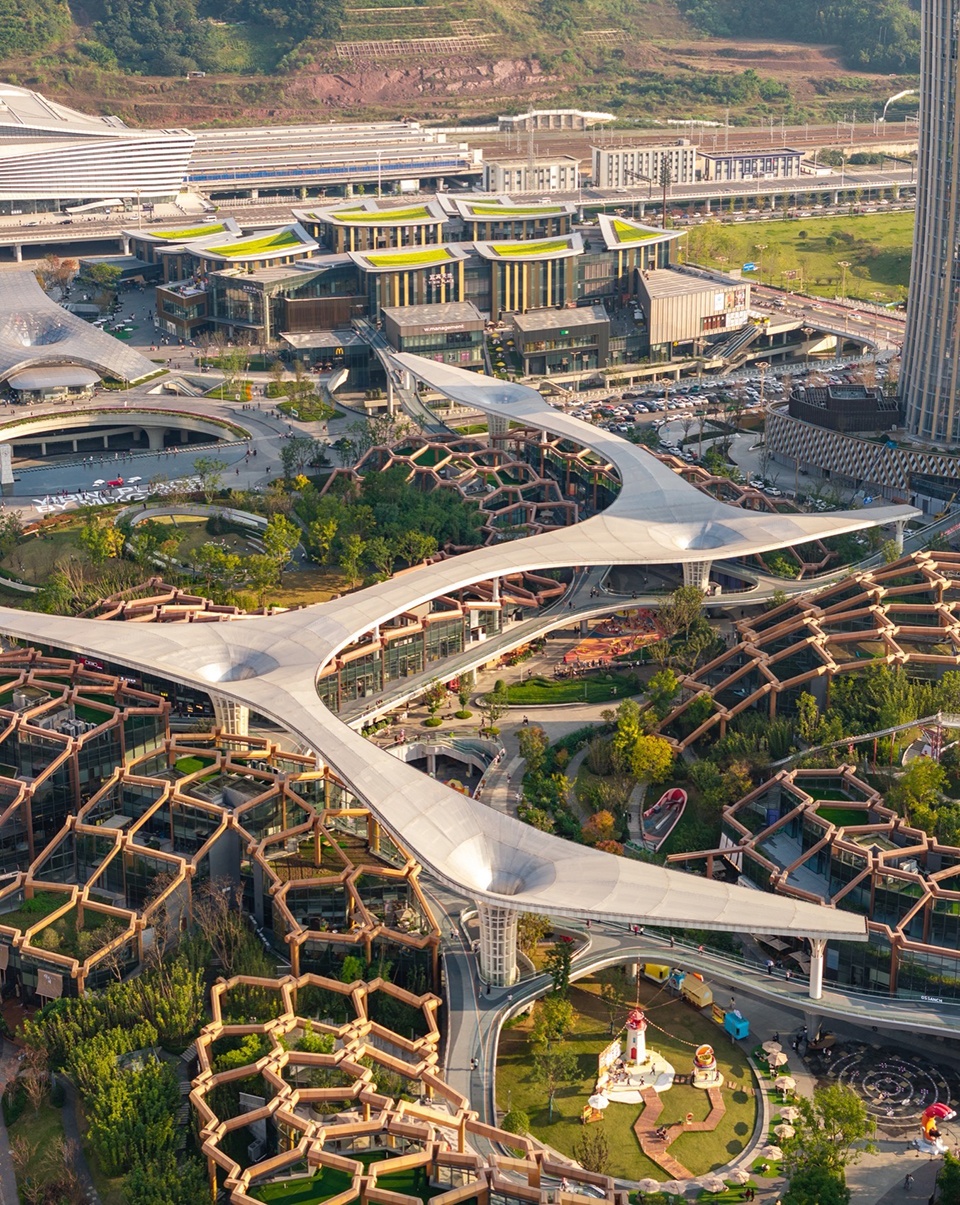 The 505,000-square-foot high-speed rail station, designed by China No.2 Railway Design Institute in collaboration with China Southwest Architectural Design Institute, provides long-distance and local transit connectivity between Chengdu, Chongqing, Guiyang, and Kunming.