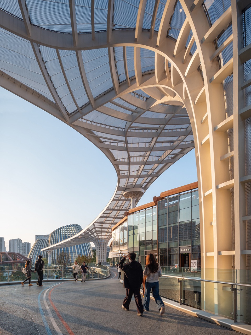 ▼蜿蜒的步道、空中连廊与茂密的植物冠层在此自然交织,Multiple layers of pedestrian paths, elevated walkways, and planted canopies