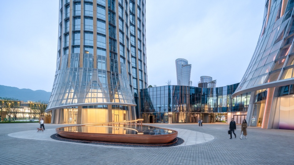 总体规划融合了绿植屋面、种植露台和露天步行体系,再现森林地表的层次感。核心区八座极具雕塑感的塔楼拔地而起,其设计灵感源于翠竹的形态与刚柔并济的特质,由佩里克拉克建筑师事务所(PC&P)携手本地设计机构四川省建筑设计研究院(SADI)共同创作。这些塔楼高度从 23 层到 33 层不等,以富有韵律的束状组合排列,通过曲线化形体与竖向肌理的强调,将本地传统文化中的竹意书法笔触转化为现代建筑立面语汇。