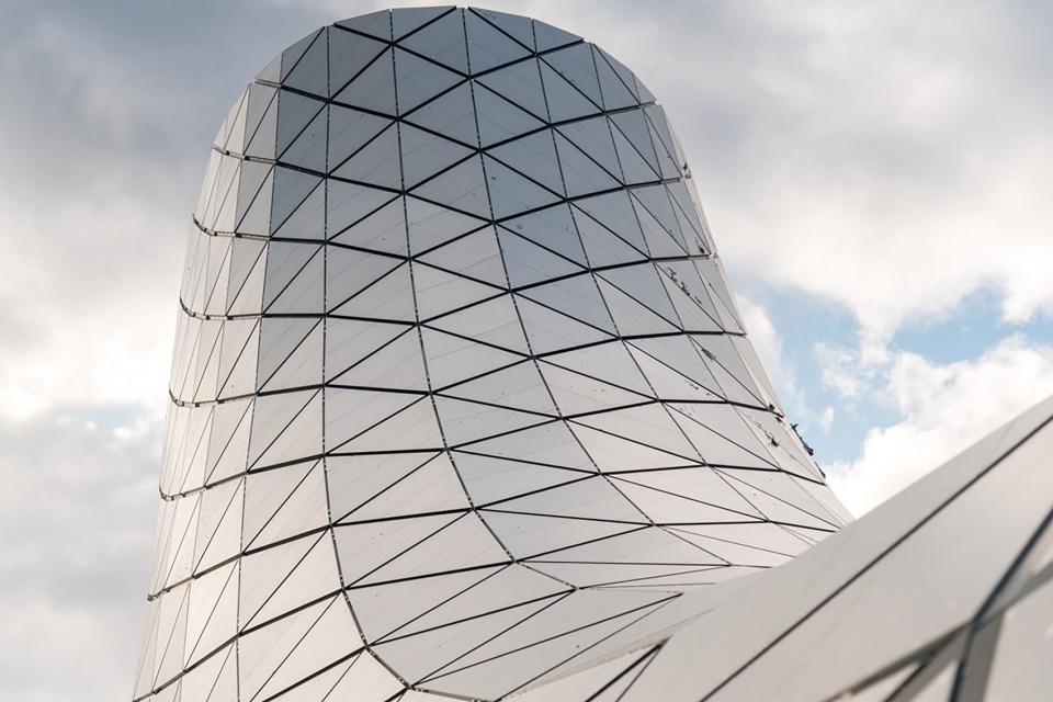 Sculpturally integrated, the 50 m vent stack contrasts the light, filtered net structures with a grounded, fluid form, its metal surface catching light to accentuate the fluid movement of the form.