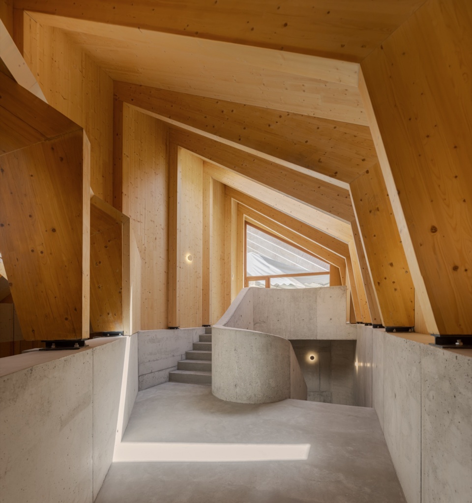 酒庄在材料选择上呼应了当地自然环境中粉褐色、绿色与灰色的色彩谱系,强调传统工艺与手作技艺,同时借助现代技术加以更新。片岩与花岗岩被用于建筑外部构件及室内混凝土挡土墙。主体空间结构采用胶合木框架与CLT(正交胶合木)板材,并覆以预制GRC(玻璃纤维增强混凝土)幕板,这些构件均产自酒庄以北不足150公里的地区。