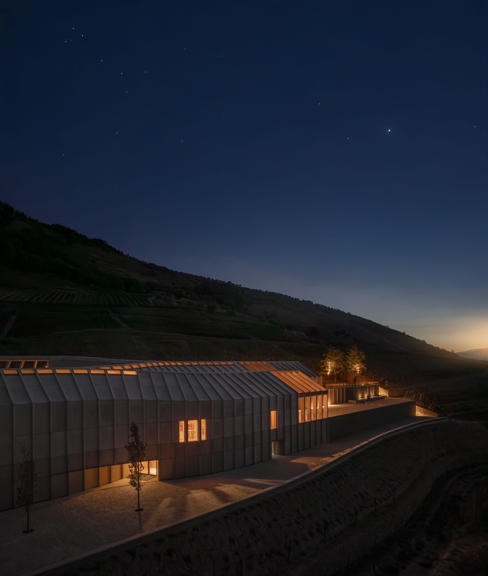酒庄水平延展的曲线体量,以及不同功能区之间的流线组织,呼应了周边山谷与丘陵中葡萄园的锯齿形纹理。然而,设计并未对景观进行直接的形式化复刻,以免影响日常运作、交通与沟通效率。相反,建筑顺应地形台地向下展开,其空间序列映射了内部酿酒工艺的运作逻辑——借助重力完成酿造流程,这也是杜罗河沿岸地区普遍采用的方式。酒庄在此以当代运营条件,清晰展现了这一极具地域特色的重力酿酒体系。建筑的整体构成因此呈现为一组相互交织的“船仓”式空间,顺着既有地形坡度展开,并在不同室内标高层面中加以复现。
