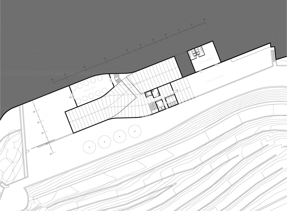 酒庄主立面设有访客中心入口,包含接待区与酒品商店。由此向上可抵达设有全玻璃立面的会议室,以及位于宽敞阳台式廊道中的品酒空间,俯瞰建筑中央船仓内的酒窖陈酿区,同时远望葡萄园与河流。这些空间可直接通往室外,通过一处面向杜罗河的大型露台连接葡萄园与小教堂。这里定期举办推广酒庄与地区形象的活动,在赞颂景观与建筑的同时,推动高端葡萄酒旅游的发展。