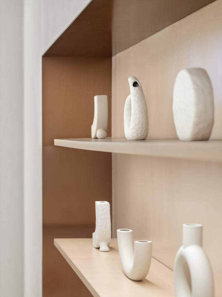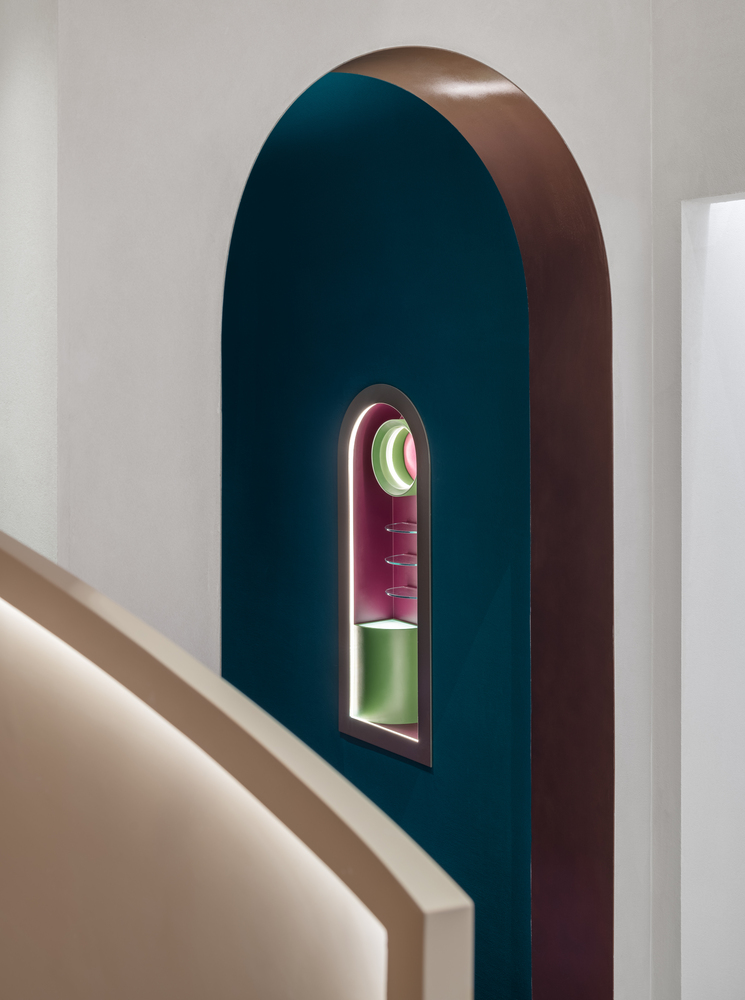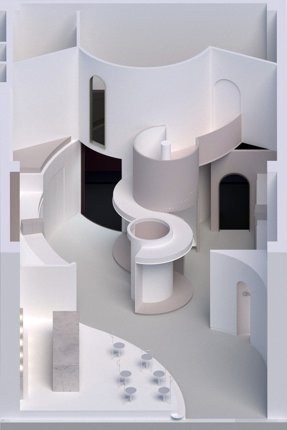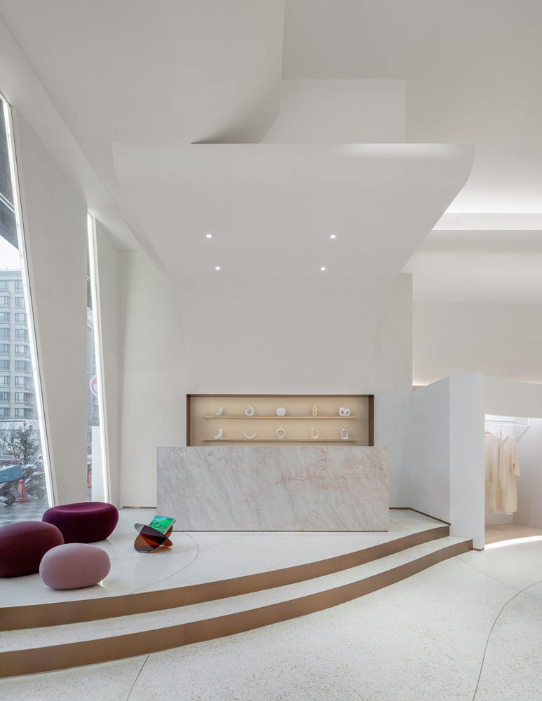 The design of the space is based on the texture and color of the cream, bringing a vision of softness and refinement to the store. The main shape was inspired by a double-layered cream cake.
