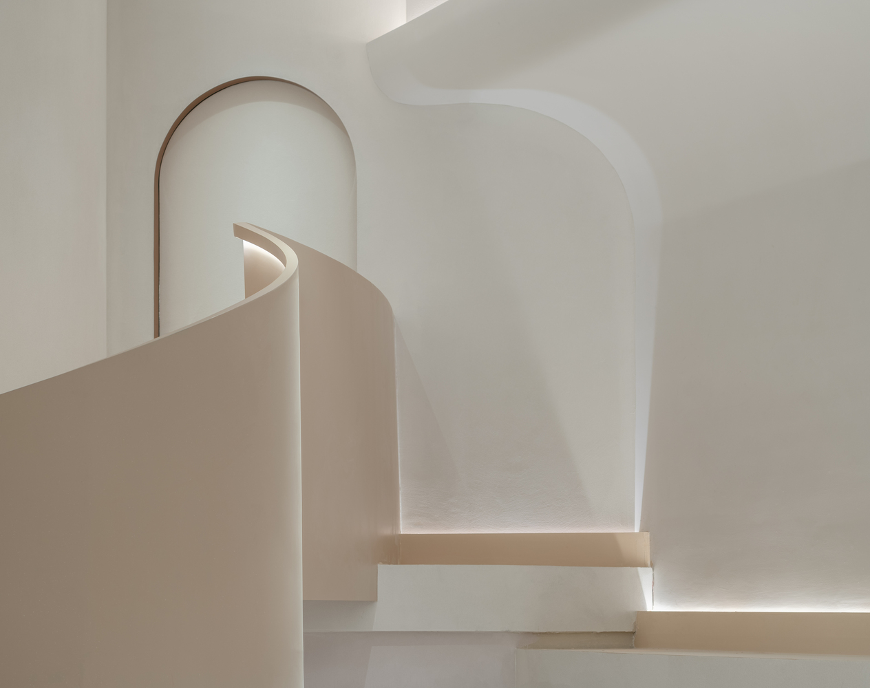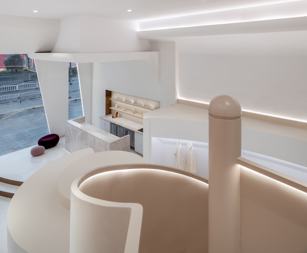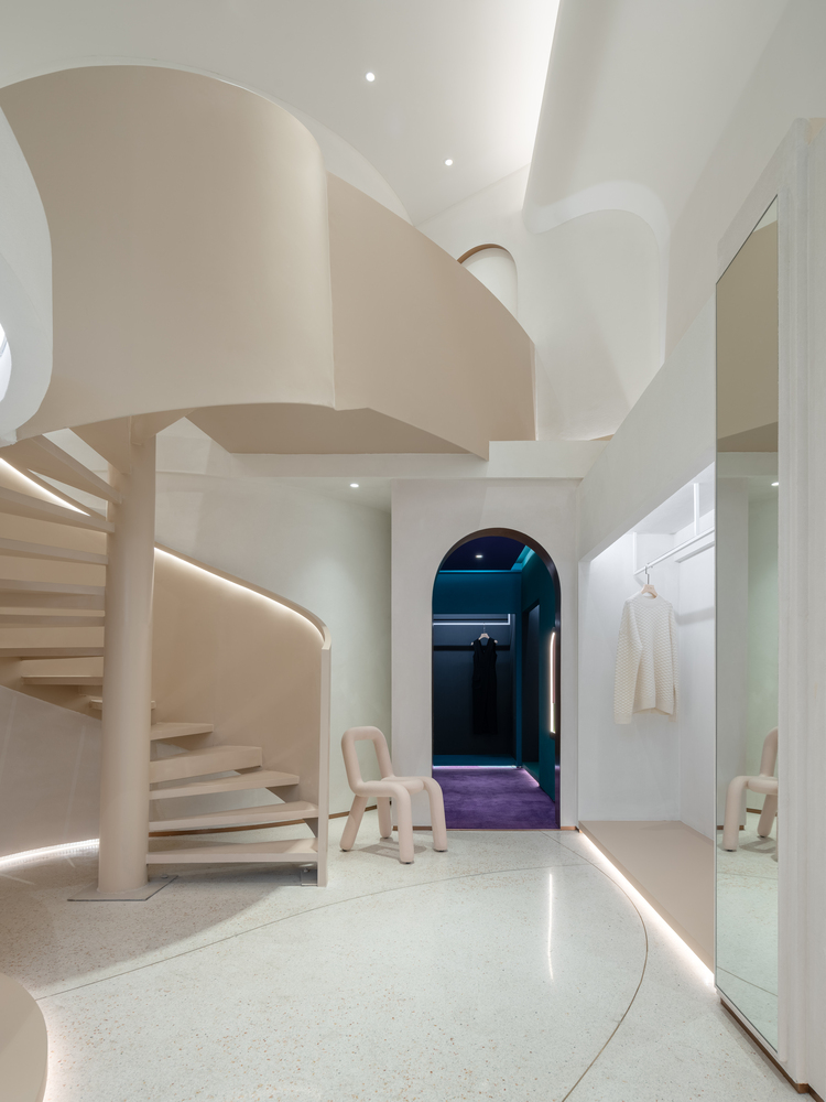 设计师选择在地面上使用纵横交错的弧形图案来反映奶油的质感。选择柔和的玫瑰色大理石来强调收银台。店内的大窗户为空间提供了充足的采光,因此设计师选择在这里设置咖啡厅来提升购物体验。栗色的螺旋楼梯通向楼上的办公室。它也被设计为客户的拍照点。天花板和墙壁的复杂弯曲结构旨在提供一个更清洁的空间,将所有必要的管道隐藏在里面。
