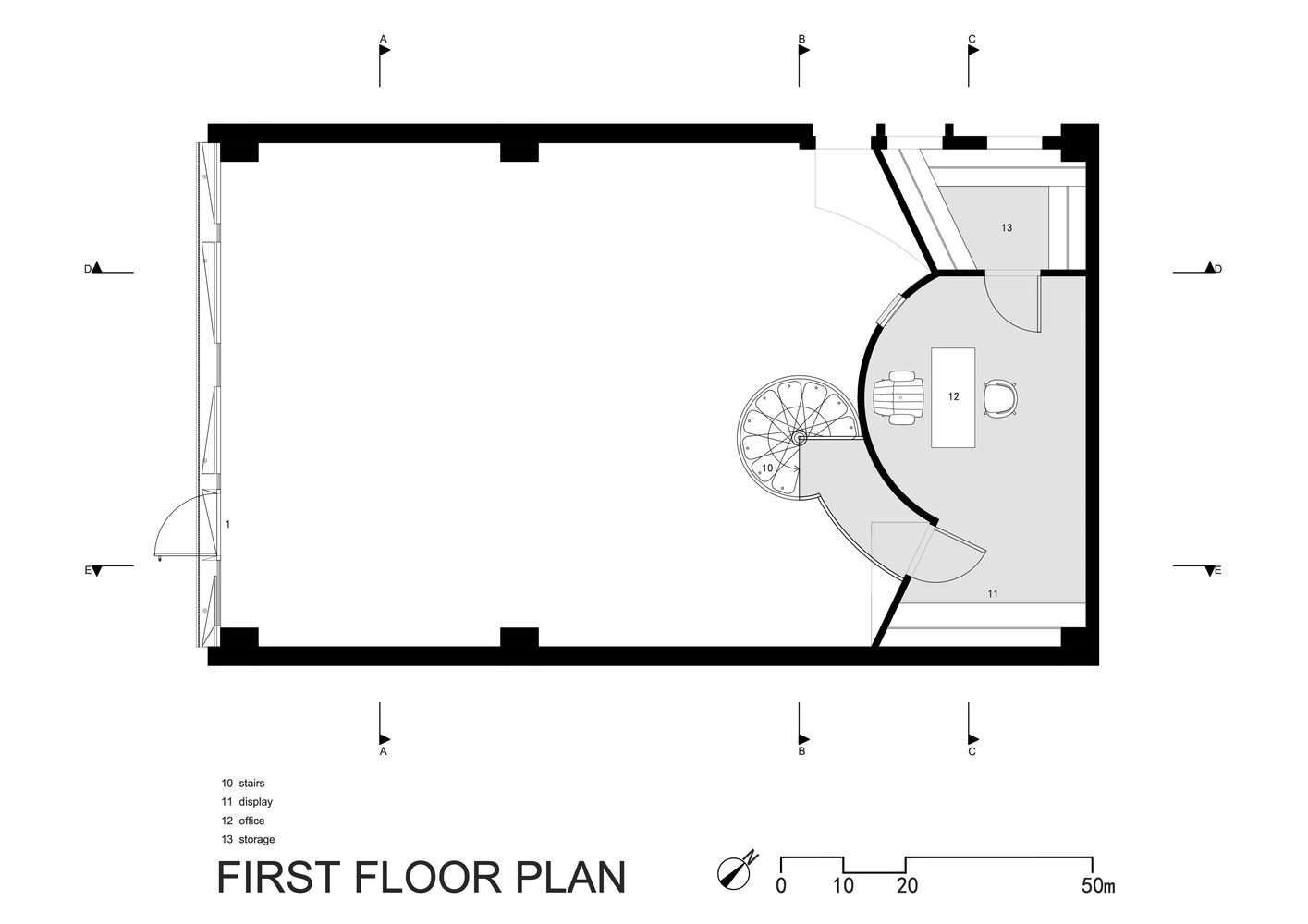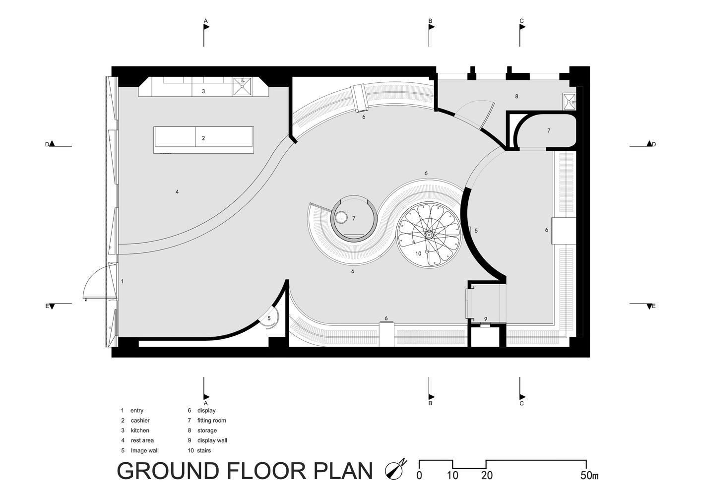 店铺位于百货公司的底层,一个120平方米的长方形空间,层高6米。为了吸引客人进入空间,设计师用充满活力的灯光装饰了门把手。入口处的Anarc形墙将顾客首先引导到咖啡休息区。弧形墙末端的重叠变化和灯光被用来绘制一个“C”的形状,这是对商店名称的另一个视觉点头。