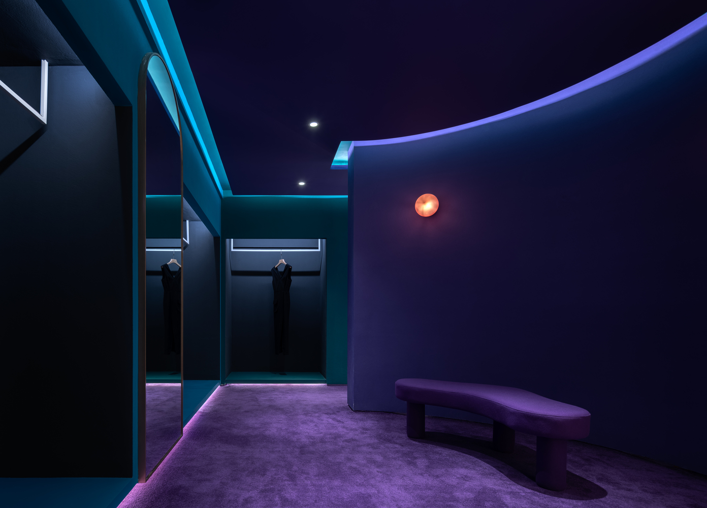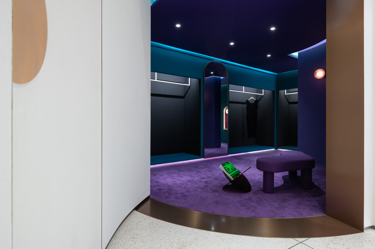 为了保持对空间的开放性,设计师将夹层的尺寸增加到空间的边缘。为了创造最佳的购物体验,设计师考虑了空间内客人的流动,因此设计师选择了位于中心的弧形试衣间。在空间的尽头,设计师使用了对比鲜明的蓝莓色,给参观者带来了意想不到的惊喜。蓝色/紫色空间内的珠宝窗口象征着珠宝盒内的宝石。这个色彩缤纷的区域包括一个休息区、试衣间和一个配件展示。该空间也可以是 VIP 客户的私人区域。空间之内,还有一扇门,通向外面的另一个奶油色空间。