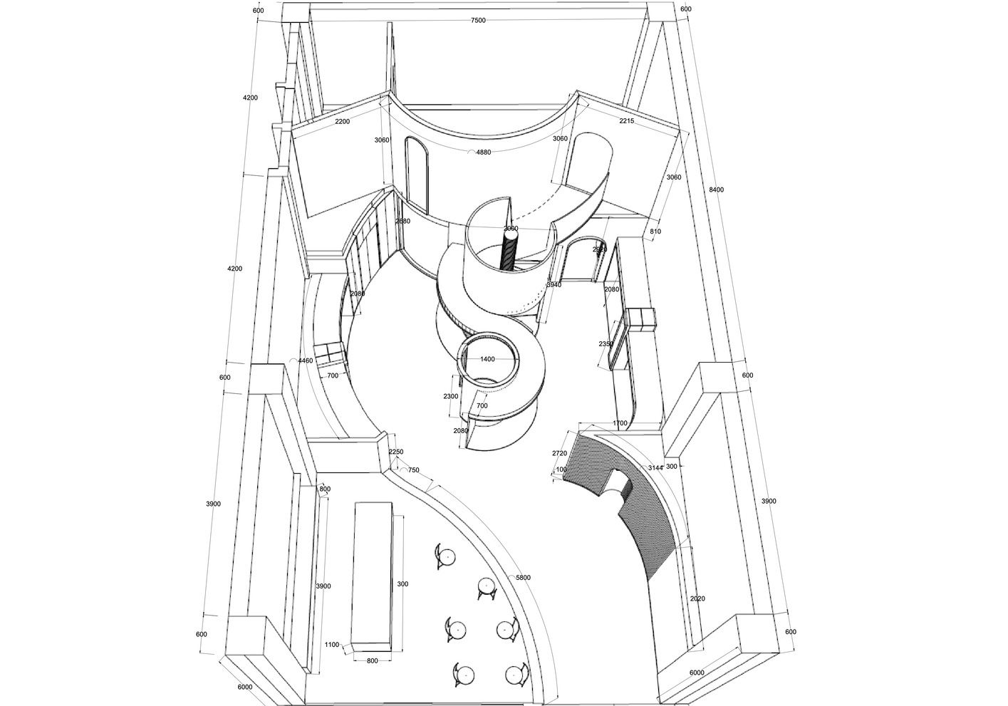 The designers chose to use a crisscrossed arc-shape pattern on the ground to mirror the texture of cream. Soft toned rose-colored marble was selected to emphasize the checkout counter. The large windows inside the shop provide sufficient light to the space, so the designer chose to set up a coffee lounge here to upgrade the shopping experience. The maroon color spiral stairs leads to an office upstairs. It was also designed to be the photographable spot for clients. The complex curved structure of the ceilings and the walls is intended to present a cleaner space, hiding all the necessary pipes inside.