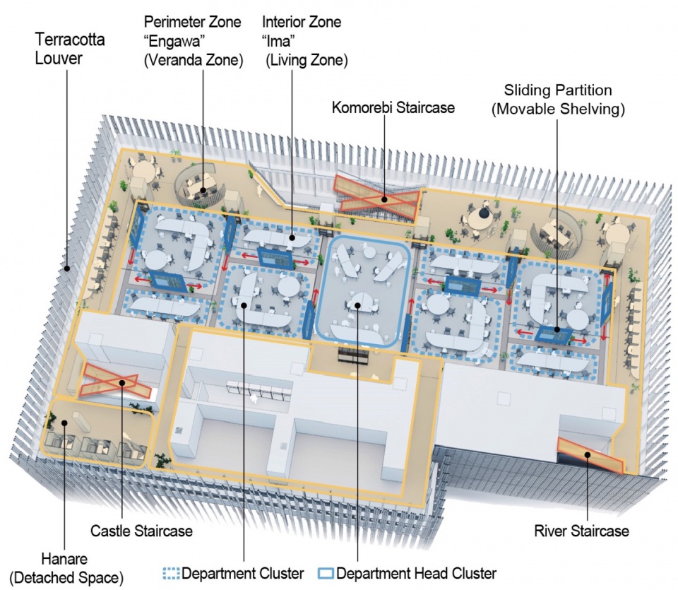 As a solution, we proposed a workplace based on a modern interpretation of traditional Japanese architecture: an intermediate space, akin to an engawa (veranda) that wraps around the living areas, softly partitioned by flexible dividers such as fusuma (sliding doors) and shoji (sliding screens).