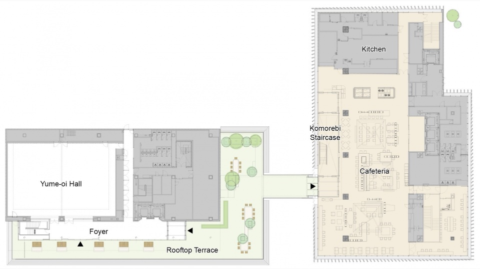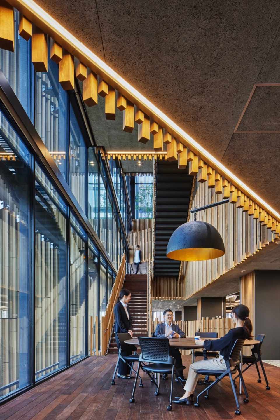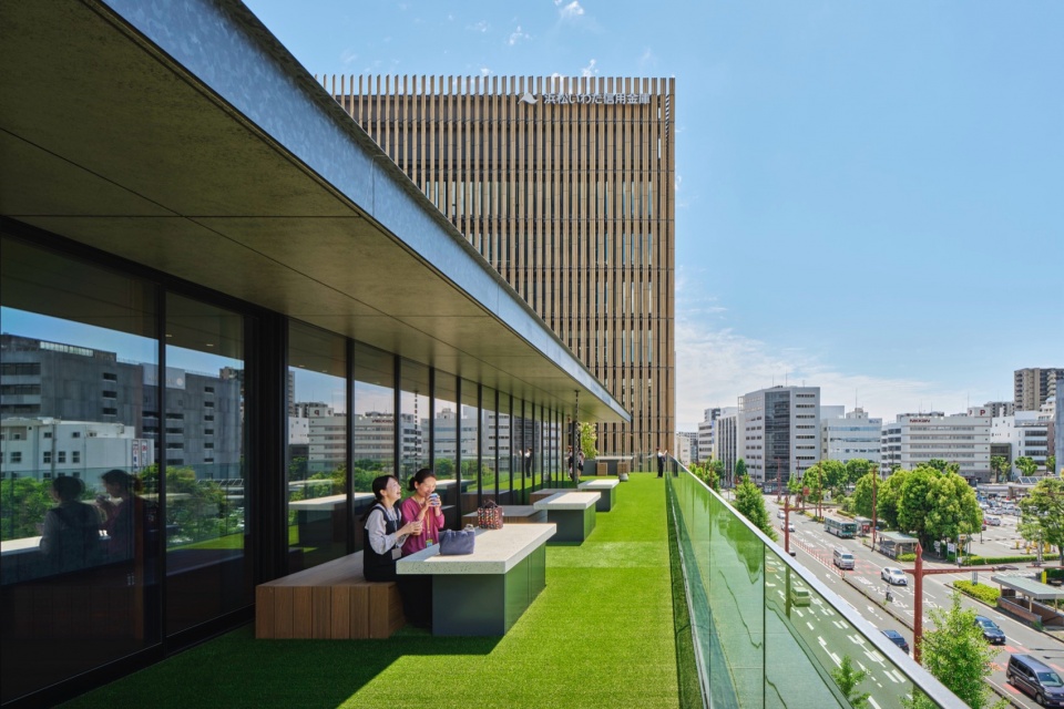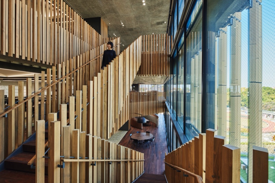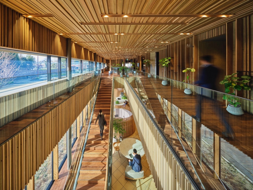 连接上下层的檐廊留有超过5m的充裕空间,不仅可用于移动,还可供人伫立和聚集,作为工作场所的一部分发挥作用,形成了一个容许外部环境影响、“不均匀”的温热环境、声环境和视觉环境。建筑外围覆盖着陶土百叶和与之呼应的木质百叶,在确保浜松城景观视野、控制日照和遮挡来自住宅区的视线的同时,营造出宛如漫步于天龙美林树木间的舒适感。在檐廊的一角,还设置了隐蔽又独立的洽谈空间“离室(离开主建筑的独立房间)”。