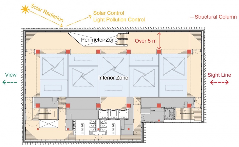 The prior-held belief that ‘the office = a column-free long-span structure’ was challenged. Offsetting the perimeter columns by five meters created a nested plan that structurally liberated the perimeter. The perimeter zone, which serves as a buffer between the exterior and interior, was designed to resemble a veranda. The enclosed interior zone (living room) yields spaces with distinct environments that offer variety in workplace. The living room is softly partitioned by raised ceilings and movable shelving. This space can transform into a workplace where all staff, from new-hires to managing directors, can gather, reflecting the company culture of psychological closeness among staff and vigorous interdepartmental communication.
