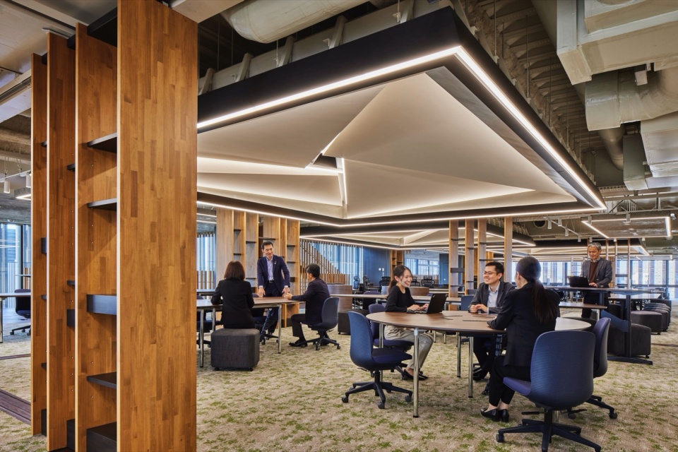 我们打破“办公室=无柱大跨度结构”的盲目信仰,将外围立柱偏移5m,实现了在结构上解放外围区域的嵌套状平面布局。将作为内外部过渡区域的外围区域视为“檐廊”,将被檐廊包围的内部区域视为“起居室”, 由此营造出环境各异的场所,从而为工作场所提供了多样化的选择。起居室通过凹凸式吊顶和移动式搁板架进行松散分隔。由于公司管理层和员工之间的心理距离较近,部门内沟通活跃,因此决定打造一个包含专务以下管理层在内、所有员工齐聚一堂、无等级之分的工作场所。