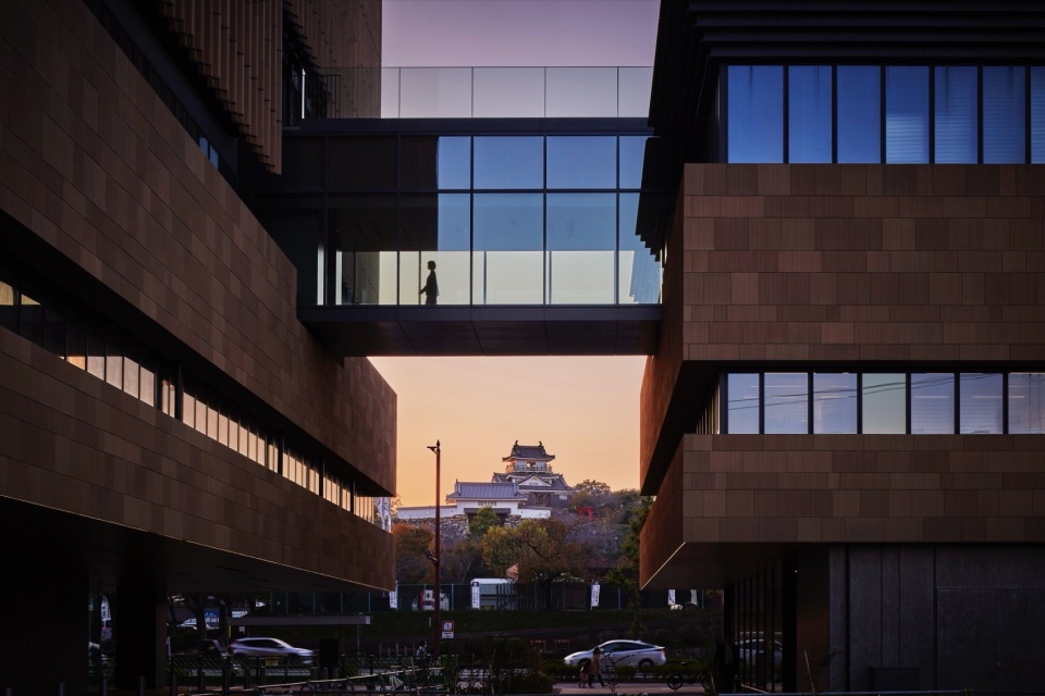 浜松岩田信用金库扎根于历史悠久的城下町,横跨面向城市象征浜松城的两块用地,实现了总部与总行两栋建筑的改建计划。