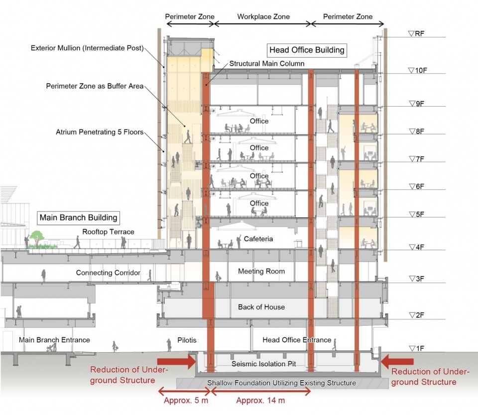 外立面设置推拉窗,并在挑空上部采用根据风力和室内外温差自动开关的自然通风系统。同时还设置促进自然通风的环保指示灯,引入了通过管理层的亲自参与得以享受丰富大自然的手法。角度渐变的外装百叶,既能适度调节过渡季节的盛行风,又能将柔和微风引入室内。通过在外周两侧采用悬臂梁挑出,形成平衡玩具状的结构形式,将外围立柱偏移5m,实现了适宜的跨度。这样一来,地下基坑的平面尺寸得以缩小,同时还减少了钢结构用量及地下开挖和主体结构的工程量。通过健全性调查,将既有地下结构体作为主体结构加以利用,从而减少了因拆除而产生的建筑废弃物。这有助于将占前期碳排放约四成的结构相关CO2排放量削减14%,为降低环境负荷做出了贡献。