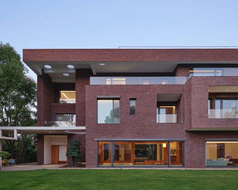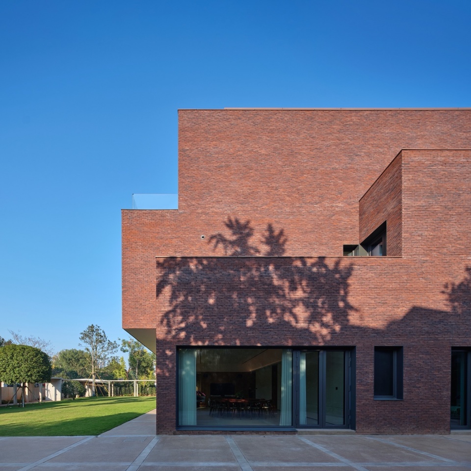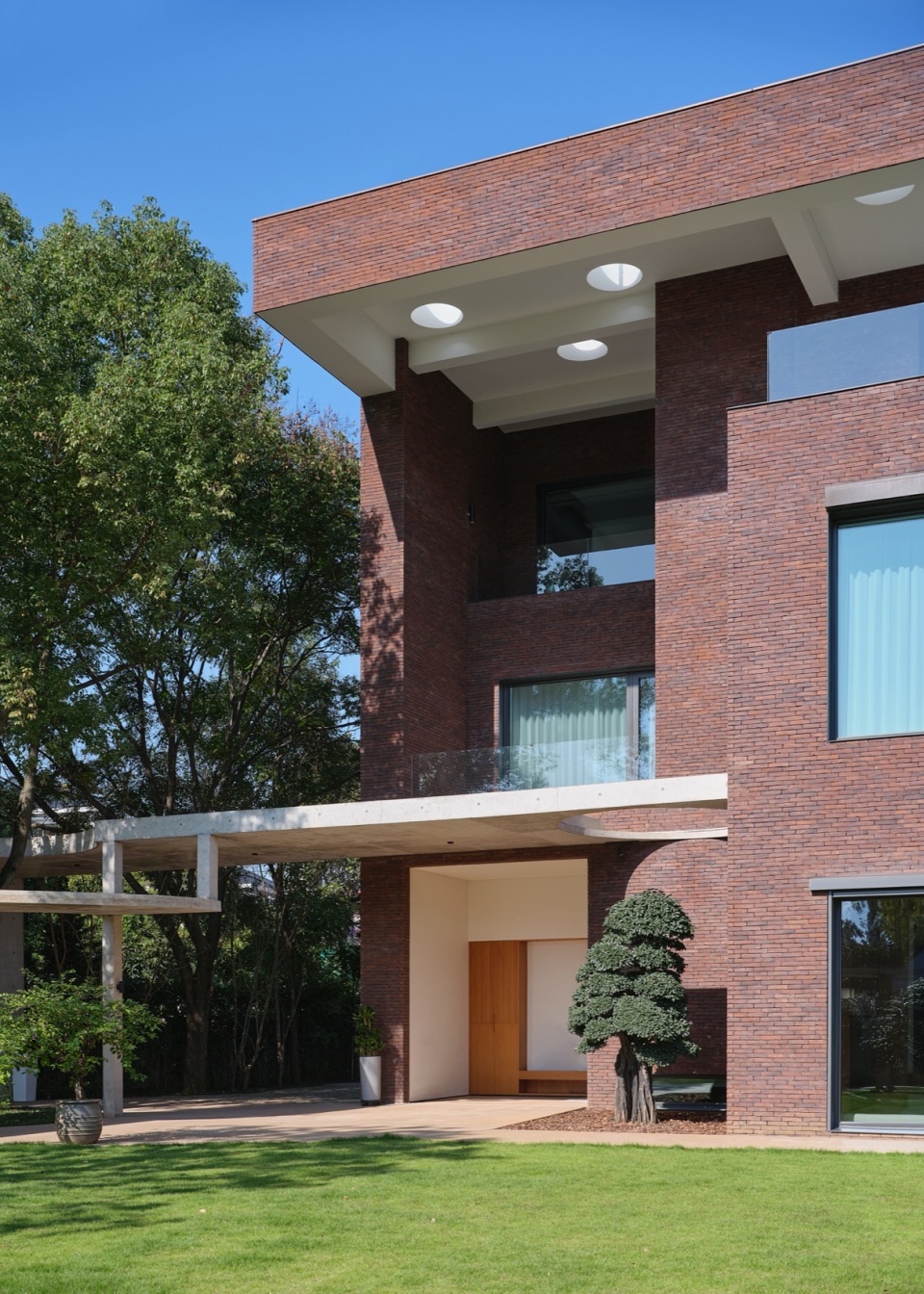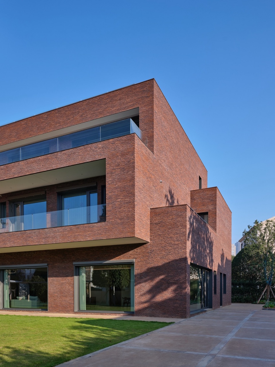在轮廓限定下,建筑外部形体近乎“被动”生成——以谦逊姿态回应规划规则与内部功能逻辑。红砖作为一种回应的“表皮”对原有装饰风格的摒弃,让我们在材料的选择上尤为审慎。我们选择了赭红色的手工黏土砖。这一选择具有多重的意味:其一,砖是一种诚实、带有手工温度与时间质感的材料,它的色泽会随着风雨日光缓慢变化,与自然共同呼吸,这与追求瞬时视觉刺激的装饰性格格不入。其二,在周围多是光滑面材的别墅群中,红砖的质朴与稳重,赋予建筑一种沉静的“在地性”,它不张扬,却以自带的温暖、质感与时间感赋予建筑沉静的重量,与周遭的绿意建立了一种柔和而持久的对话。