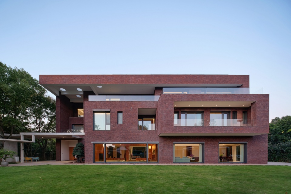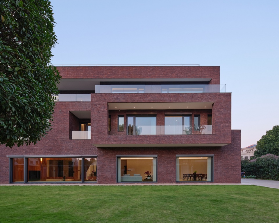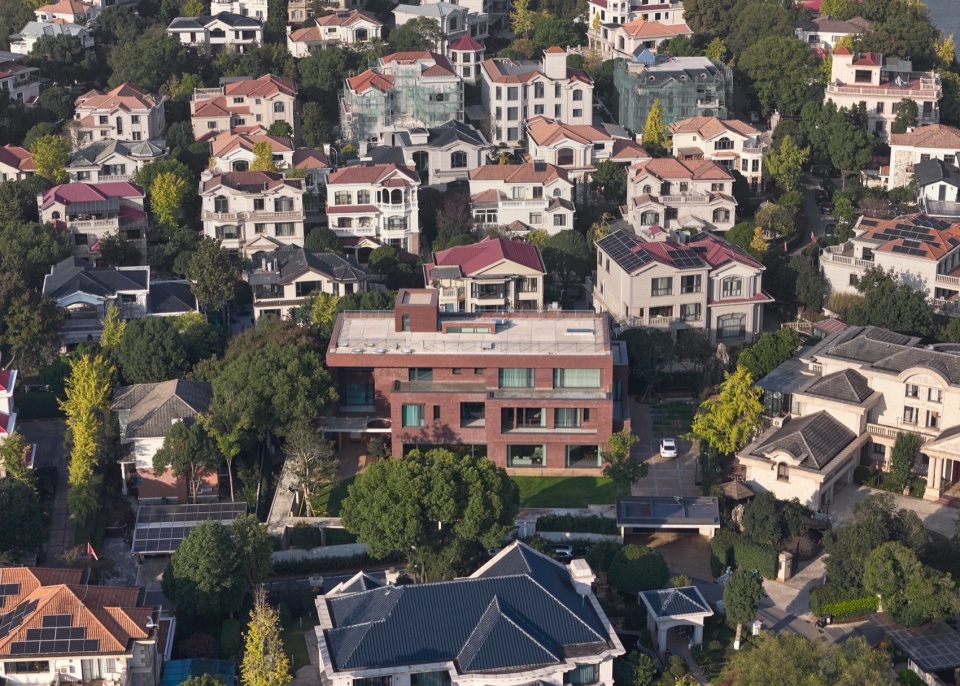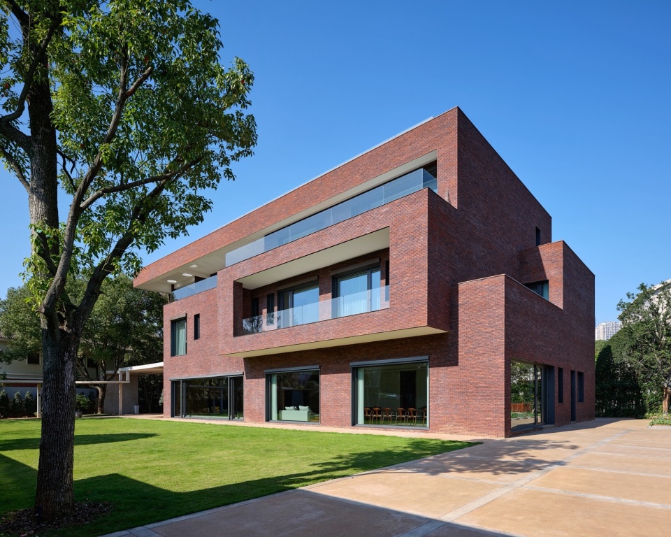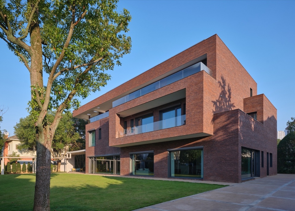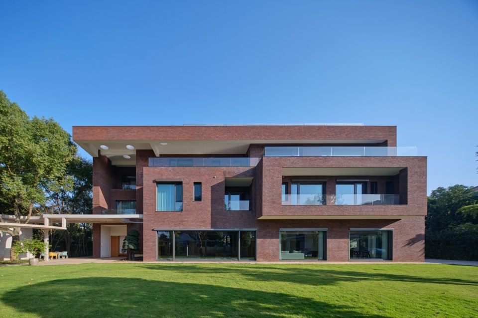 在轮廓限定下,建筑外部形体近乎“被动”生成——以谦逊姿态回应规划规则与内部功能逻辑。红砖作为一种回应的“表皮”对原有装饰风格的摒弃,让我们在材料的选择上尤为审慎。我们选择了赭红色的手工黏土砖。这一选择具有多重的意味:其一,砖是一种诚实、带有手工温度与时间质感的材料,它的色泽会随着风雨日光缓慢变化,与自然共同呼吸,这与追求瞬时视觉刺激的装饰性格格不入。其二,在周围多是光滑面材的别墅群中,红砖的质朴与稳重,赋予建筑一种沉静的“在地性”,它不张扬,却以自带的温暖、质感与时间感赋予建筑沉静的重量,与周遭的绿意建立了一种柔和而持久的对话。