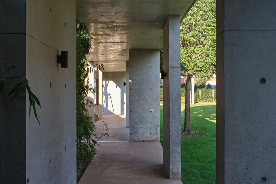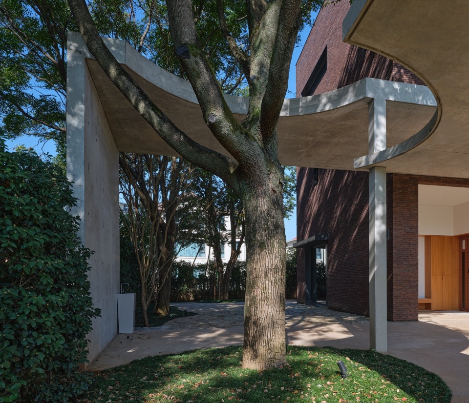 The act of entering the building is conceived as a journey infused with the Eastern spirit of youguan—wandering and viewing. A deeply cantilevered canopy of exposed concrete, like a theatrical prologue, temporarily separates the interior realm from the noise of the street. From here, a quiet, linear covered corridor extends inward along the site boundary. On one side runs a concrete wall aligned with the building edge; on the other, the central lawn gradually unfolds. The eye is guided toward the main entrance and the large glass window of the living room, yet intermittently restrained by freestanding wall planes. With each step, the mind settles. Just before reaching the entrance, the path encounters a gift from the site: a tall camphor tree standing precisely at the corner where the corridor meets the entry. Rather than removing it, we allowed the path to gently detour. The corridor curves with a smooth arc, humbly yielding to the tree before reconnecting naturally with the entrance canopy.