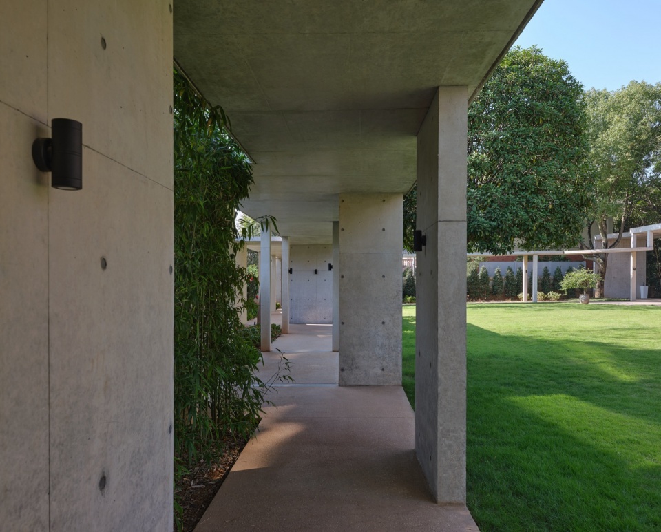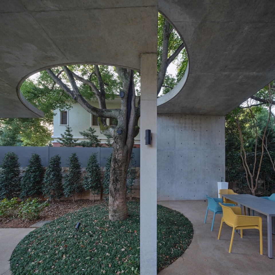 This curved detour is not a formal affectation, but the faithful record of a negotiation between site conditions and functional necessity. To maximize the central lawn, the corridor had to remain close to the boundary; to preserve the camphor tree, it had to bend. Here, form emerges as the truthful consequence of constraints. The construction detail further enriches the experience. A height difference exists between the corridor roof and the entrance canopy. At the curved junction, we “cut” a fluid opening between them, creating a natural transition. As one walks through this moment, the body subtly turns with the curve; the gaze brushes across the textured bark of the tree, and above, a sliver of sky pours down through the opening. The tree, the arc, and the cut together form a moment of pause—a scenic interlude that deepens the spatial sequence. This is the essence of wandering: the destination matters, but the journey, with its encounters and discoveries, completes the experience.