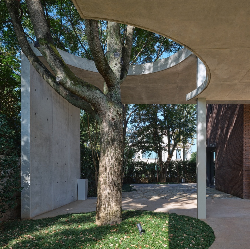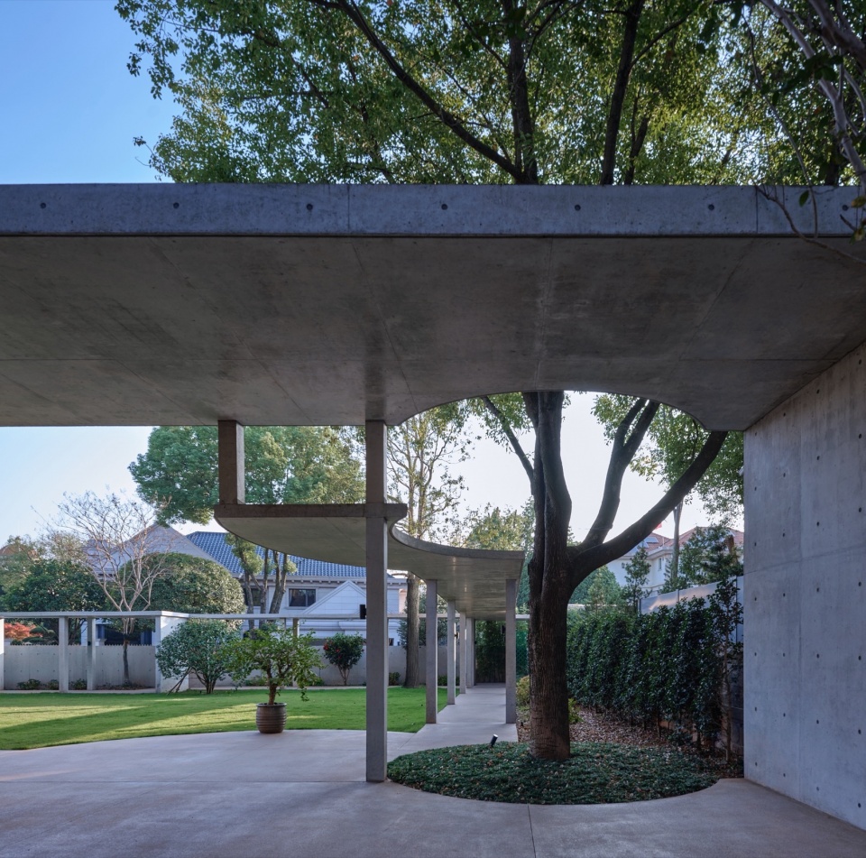 那么进入建筑的过程,则被设计为一次充满东方“游观”意趣。一个由清水混凝土整体浇筑的深挑雨棚,如舞台的序幕,将街道外的喧扰暂且隔绝。自此,一条幽净的、线性的风雨廊道,紧贴场地边界,向内蜿蜒延伸。行走于此,一侧是沿着建筑边界混凝土围墙,另一侧是渐渐展开的大草坪,视线被引导至建筑主体入口、客厅的大玻璃窗……亦被风雨廊的片墙适度地收束,心绪在行进步履中逐渐沉淀。这条路径在即将抵达建筑主体入口时,遇到了场地给予我们的一份馈赠——一棵高大的香樟树。它恰好伫立在风雨廊与建筑入口衔接的转角处。我们选择让路径温柔地“绕行”。廊道在此以一个圆滑的弧度,谦逊地避让了树木,随后再与建筑入口的雨棚自然衔接。