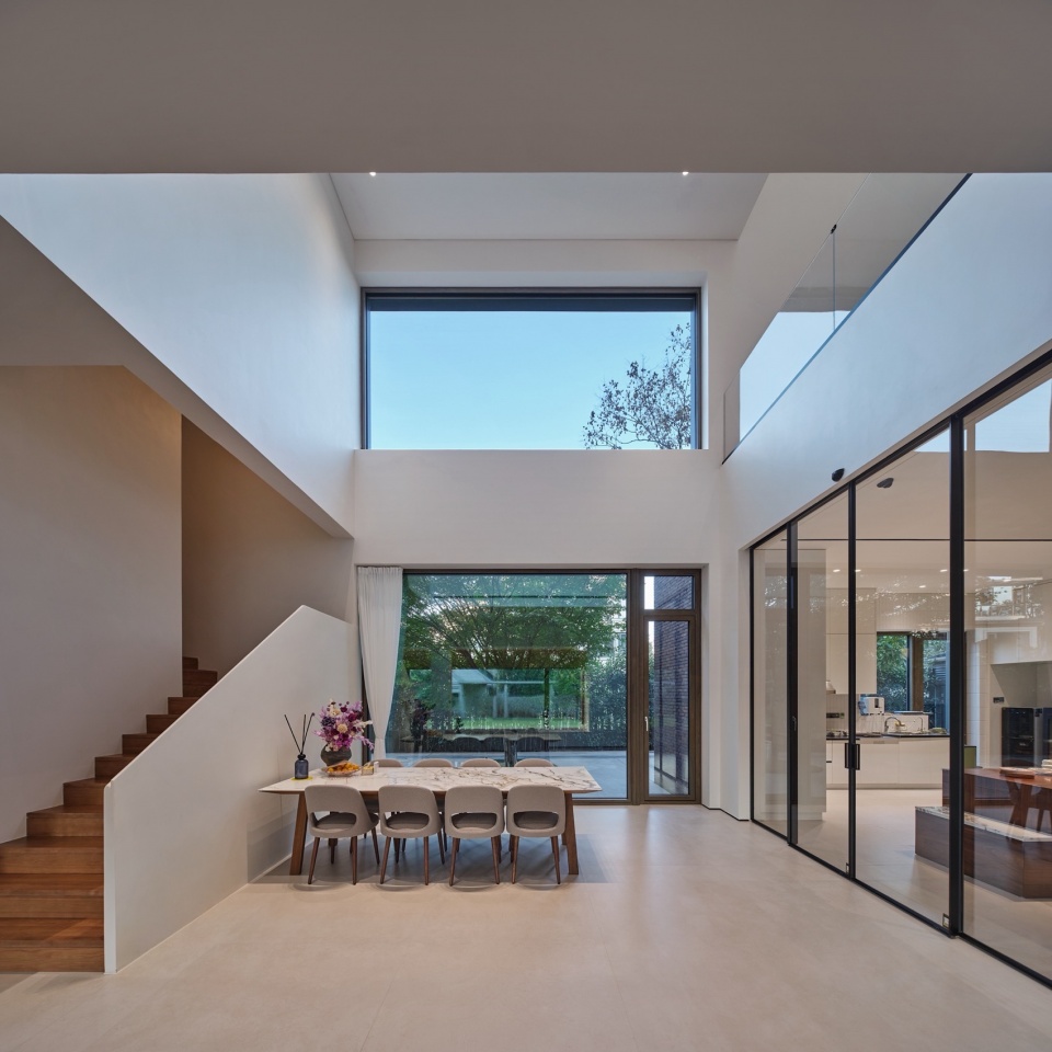 Upon entering the interior, the house transforms into a three-dimensional, inhabitable garden. In the north–south section, a partially sunken living room connects with a double-height dining space, allowing uninterrupted views across the courtyard toward the distance, dissolving the boundary between inside and outside. In the east–west section, spatial flow becomes more dramatic. A double-height family dining area on the first and second floors intersects with a double-height children’s activity zone spanning the second and third floors, together forming a vertical “shared chamber” that connects three levels. This vertically continuous space is the core of the design—not a gesture of formal bravado, but the result of careful observation of family life.