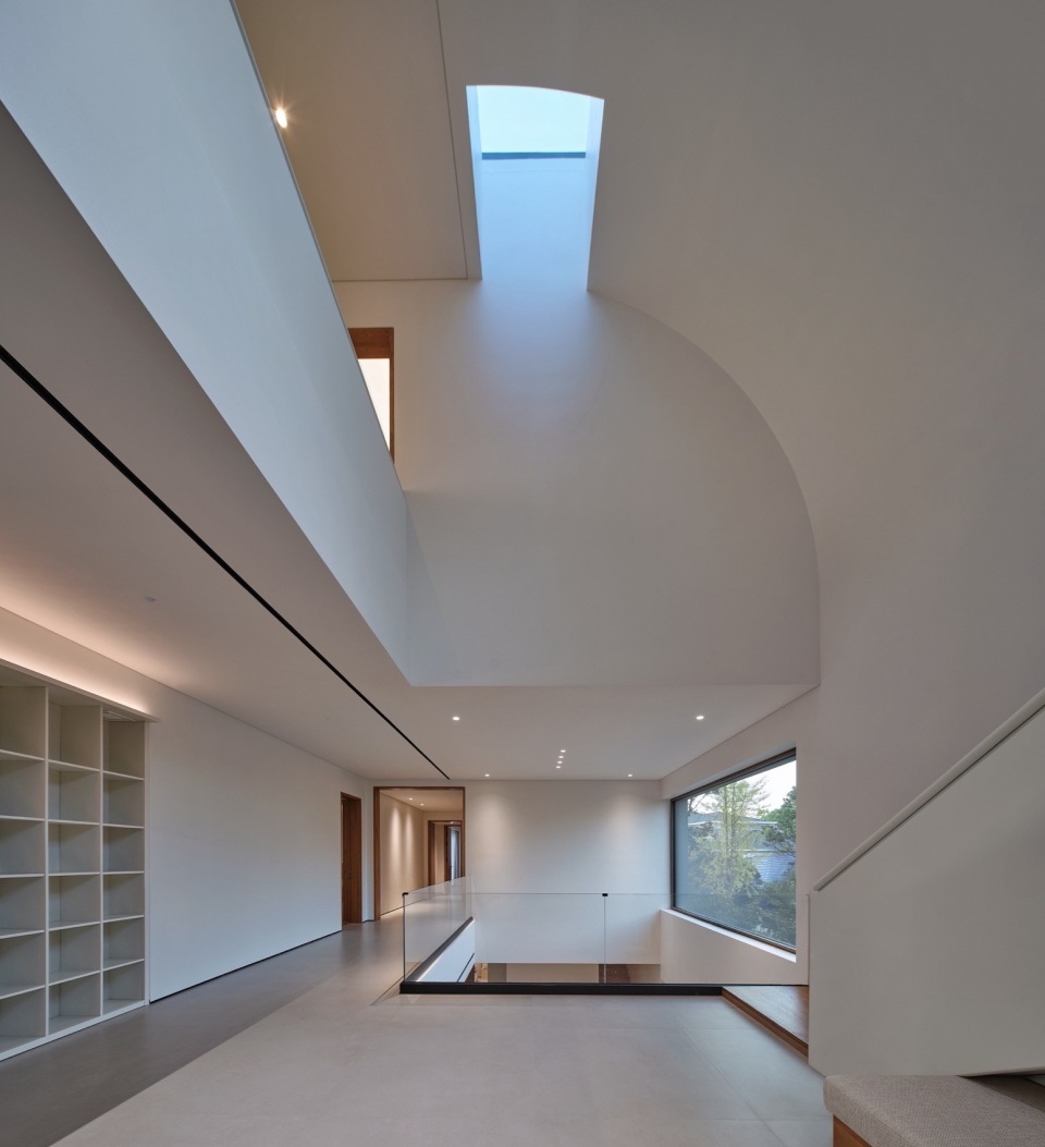 光,是这立体园林中最富诗意的“漫游者”。第一缕天光从屋顶斜射入儿童活动区的挑空,随时间在墙面与地板上缓缓“行走”,像一只无声的日晷;第二束天光,则精确地落入主卧的衣帽间;第三到光柔和得进入浴室与主卧之间的走道上,将日常的起居洗漱,点化为一场与光影的私密对话。这便是在路斯“内部满足”框架下,对情感与氛围的极致追求。