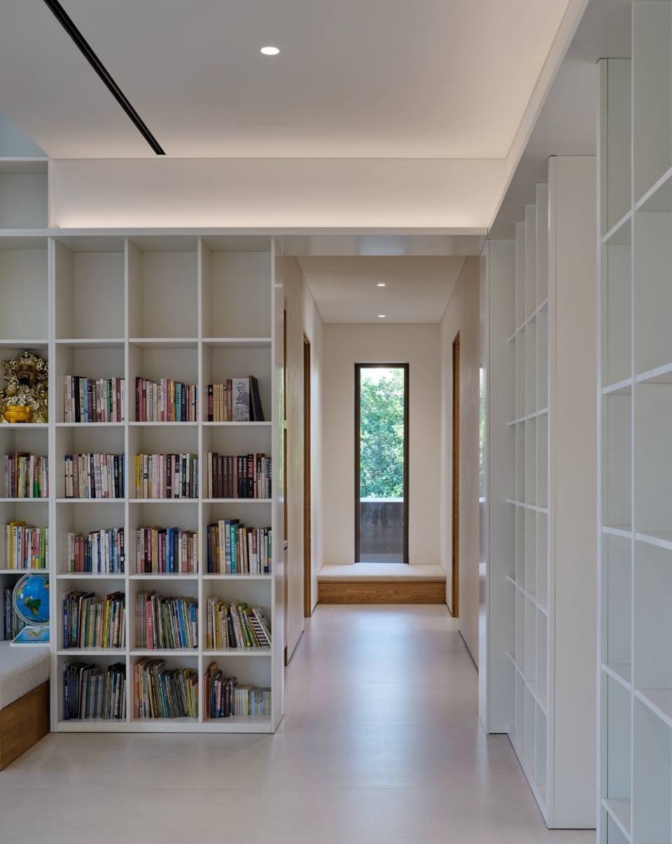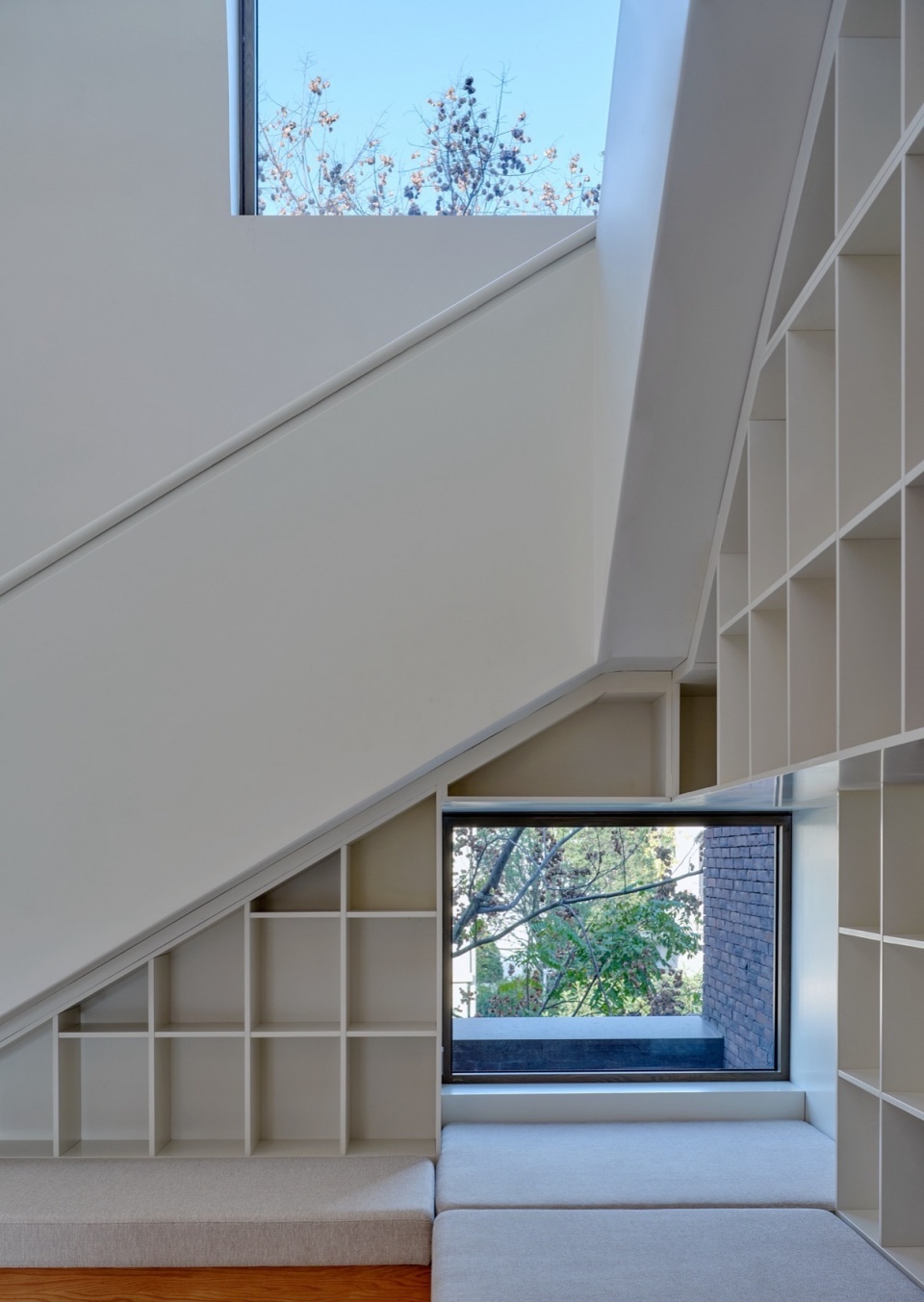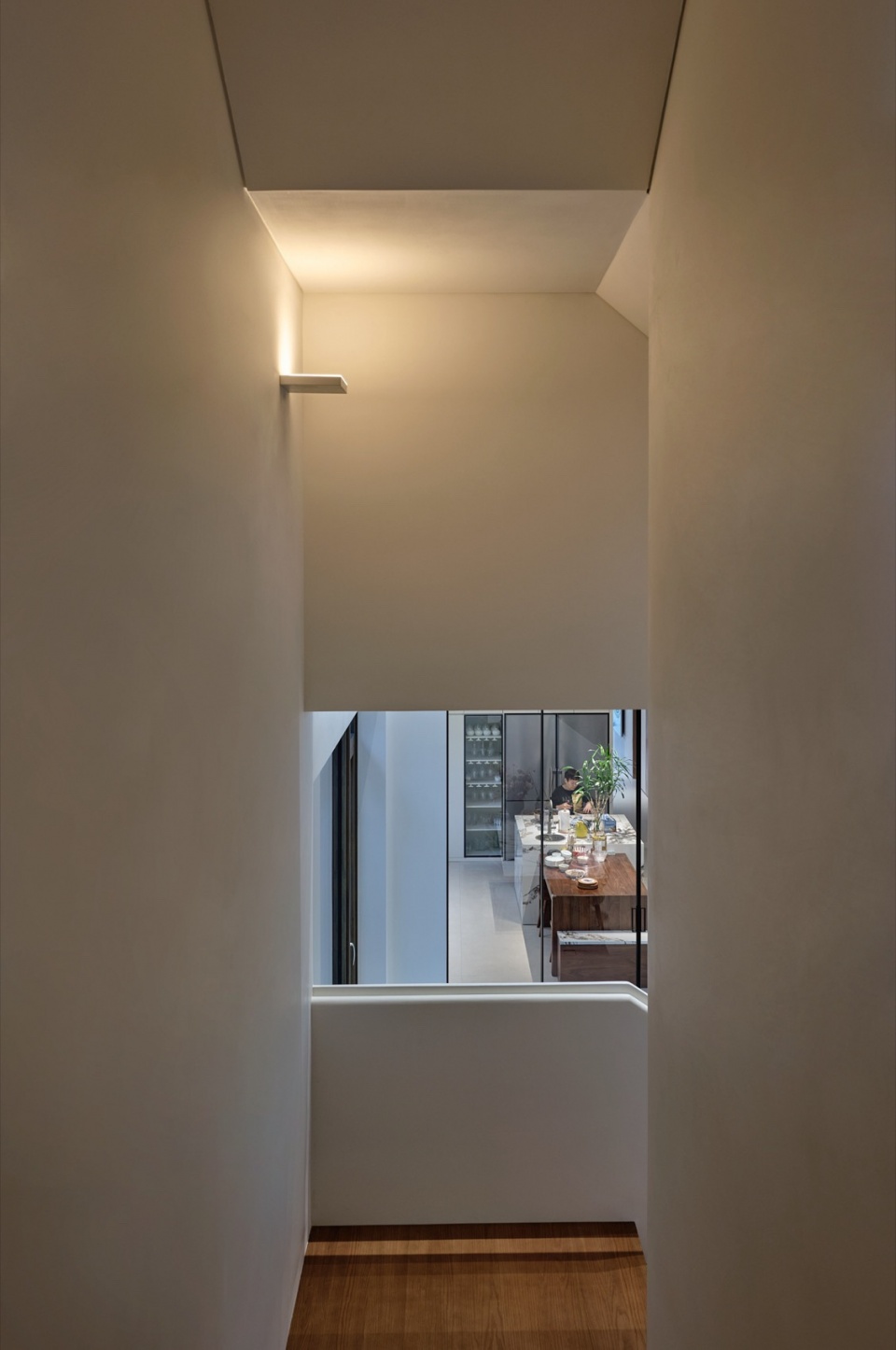 Most subtle is the narrow vertical window at the end of the children’s corridor. It frames nothing more than a corner of greenery from the neighboring courtyard, yet becomes a permanent, vibrant focal point at the end of the passage. These windows are contemporary interpretations of the art of borrowed scenery. They do not merely admit views, but through careful composition, elevate the ordinary into the poetic. Meanwhile, the building’s transparency allows glimpses of interior life to filter outward, engaging in a reciprocal act of seeing and being seen. The house itself becomes part of the landscape.