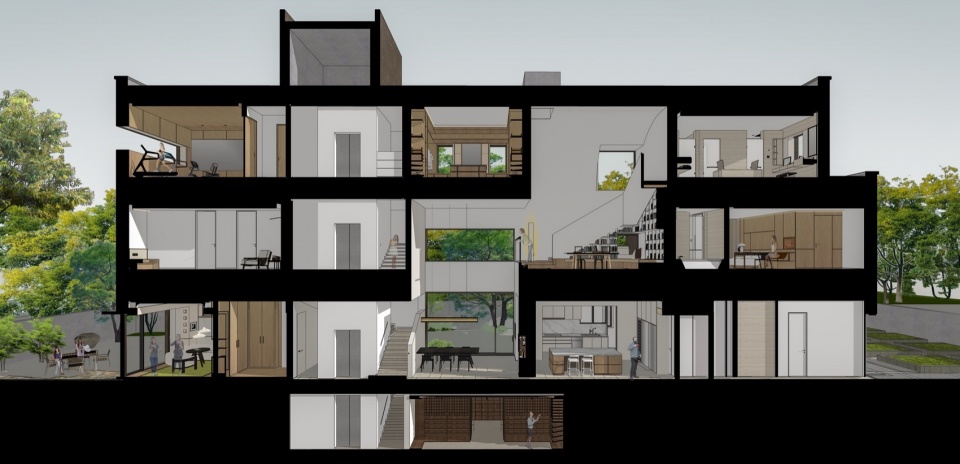 进入建筑室内,建筑化身为一个立体的、可居可游的游园空间。南北向剖面,一层局部下沉的客厅与有两层挑高的餐厅连通,视线可以毫无阻隔地越过庭院,投向远方,室内外的边界“消失”。东西向剖面,空间的流动性更加戏剧化:一、二层挑空的家庭餐厅,与二、三层挑空的儿童活动区,形成成一个贯通三层的“共享腔体”。这个垂直连通的空间,是设计的核心。它绝非为了形式的炫耀,而是源于对家庭生活最细腻的洞察。