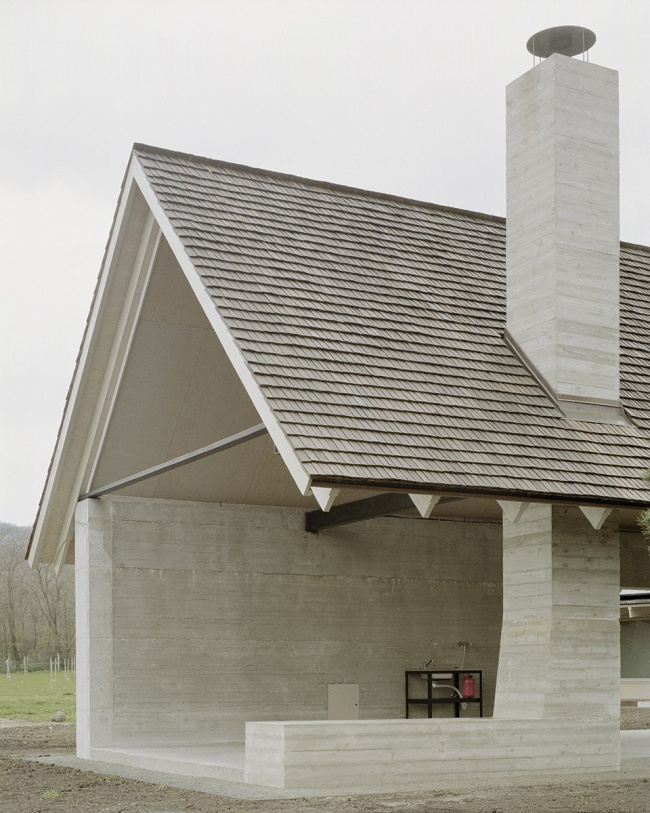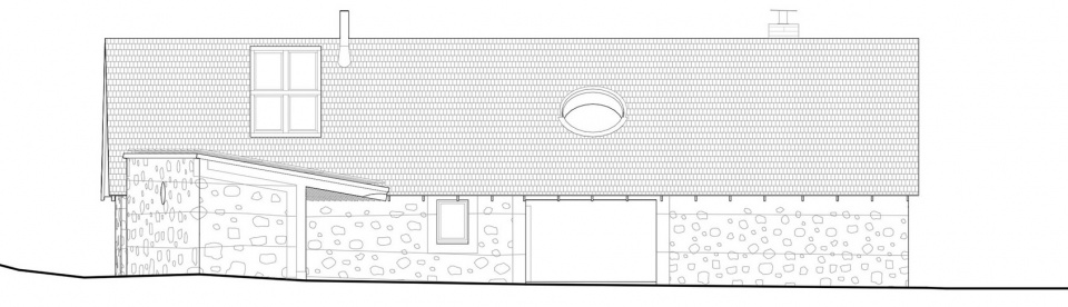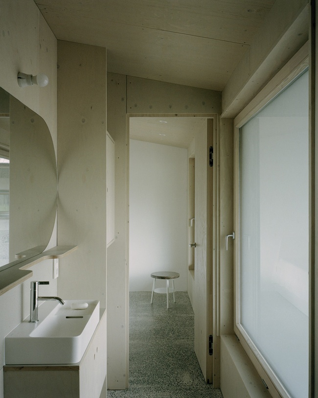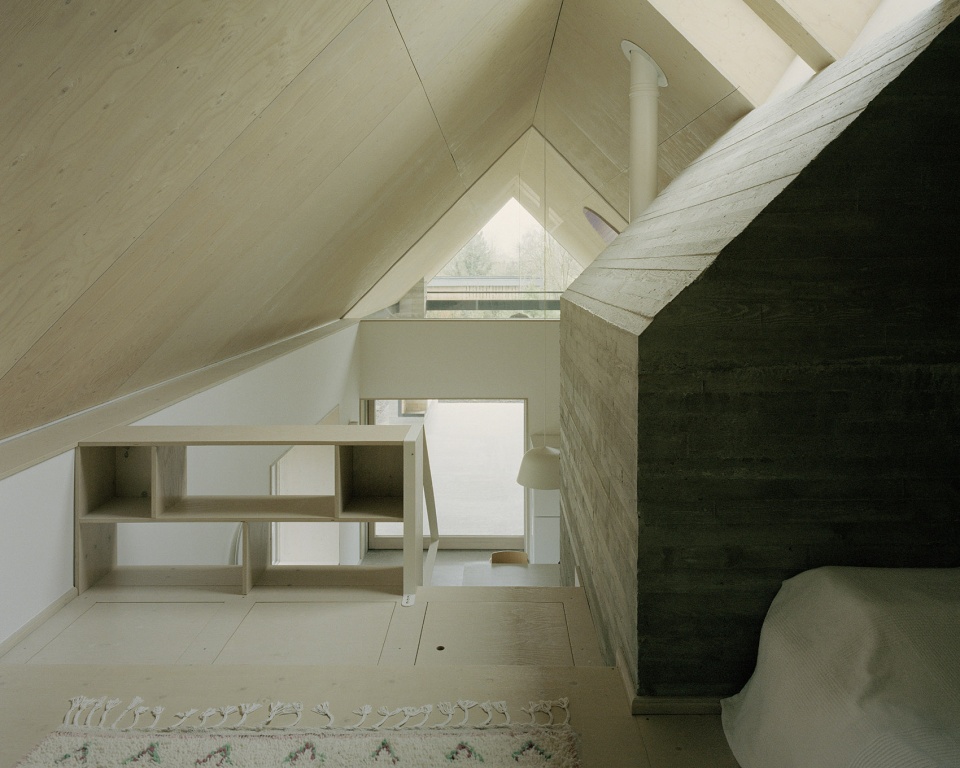 在室内空间中,云杉胶合板被用于开放式起居空间的屋顶内表面,并延伸至多件定制家具之中,形成统一而温暖的材质语言。附属建筑同样延续了这一材料体系,而其屋顶则覆盖以木瓦,进一步强化了与地方手工传统及乡村建造方式之间的联系。