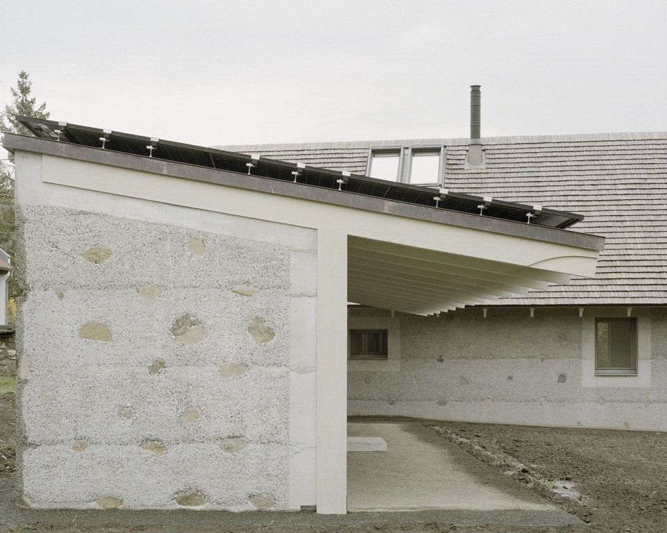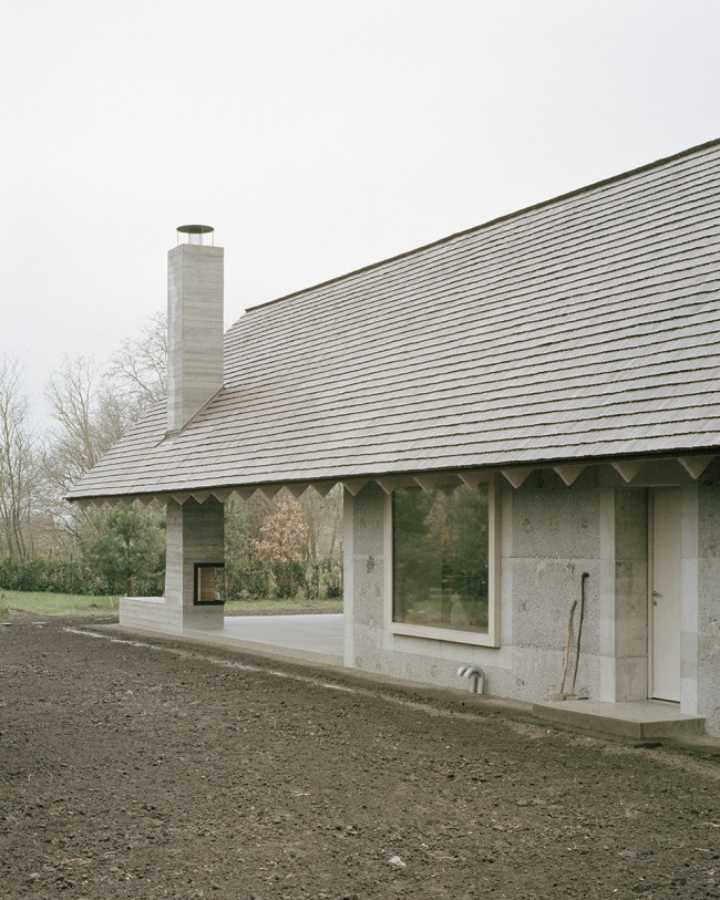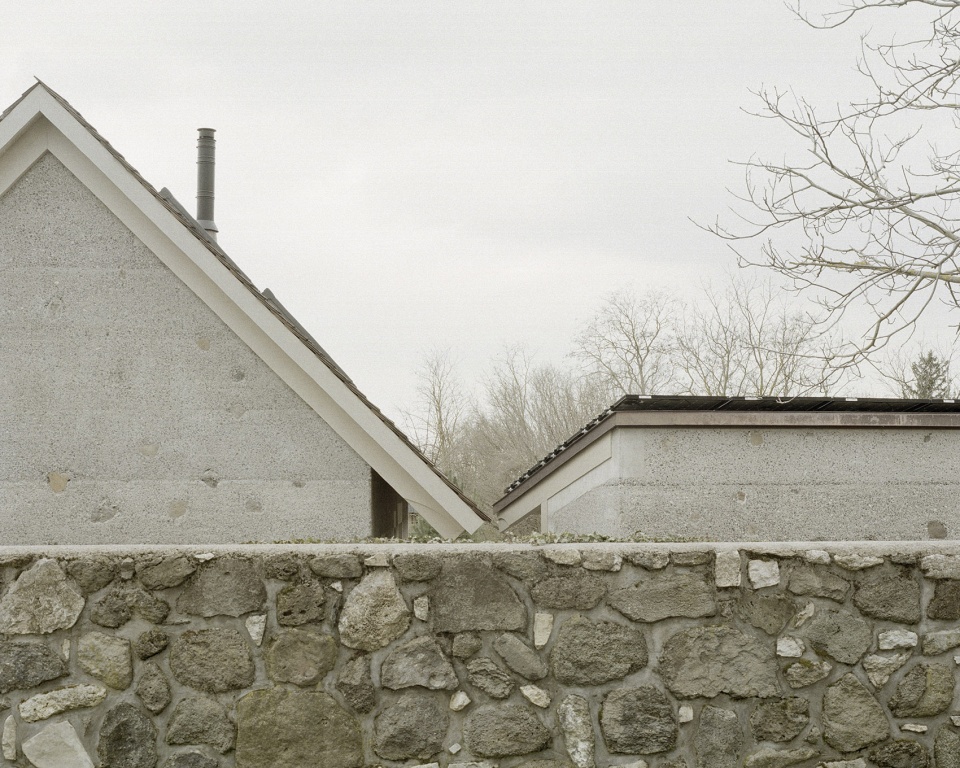 对材料连续性的坚持自项目伊始便成为核心原则。旧石屋中回收的大块石材被重新利用,嵌入新建的夯筑混凝土墙体之中。墙体采用了定制配比的混凝土,并掺入来自附近采石场的玄武岩骨料。相同的玄武岩材料也被运用于手工制作的水磨石地面,使建筑的表面肌理与当地的地质特征形成内在呼应。