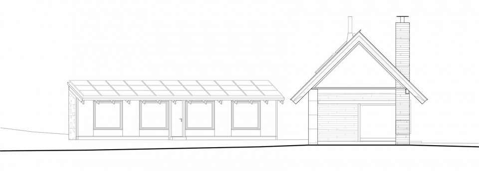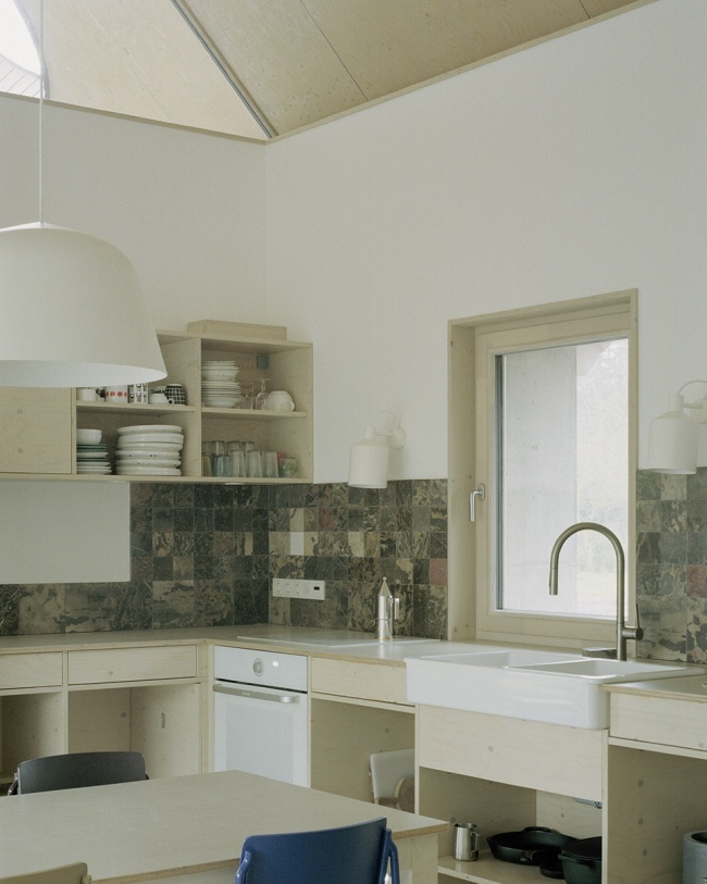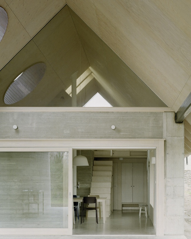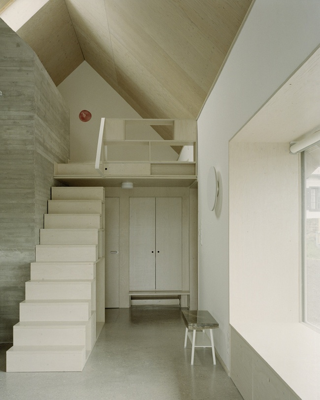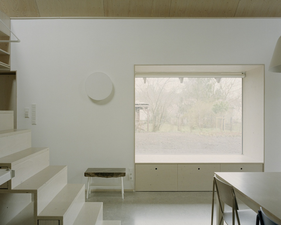 Inside, spruce plywood forms the surfaces of the roof over the open living room as well as several custom furniture pieces. The outbuilding retains this material language, while the roof is finished with wooden shingles, reinforcing the connection to local craftsmanship and traditional rural building methods.