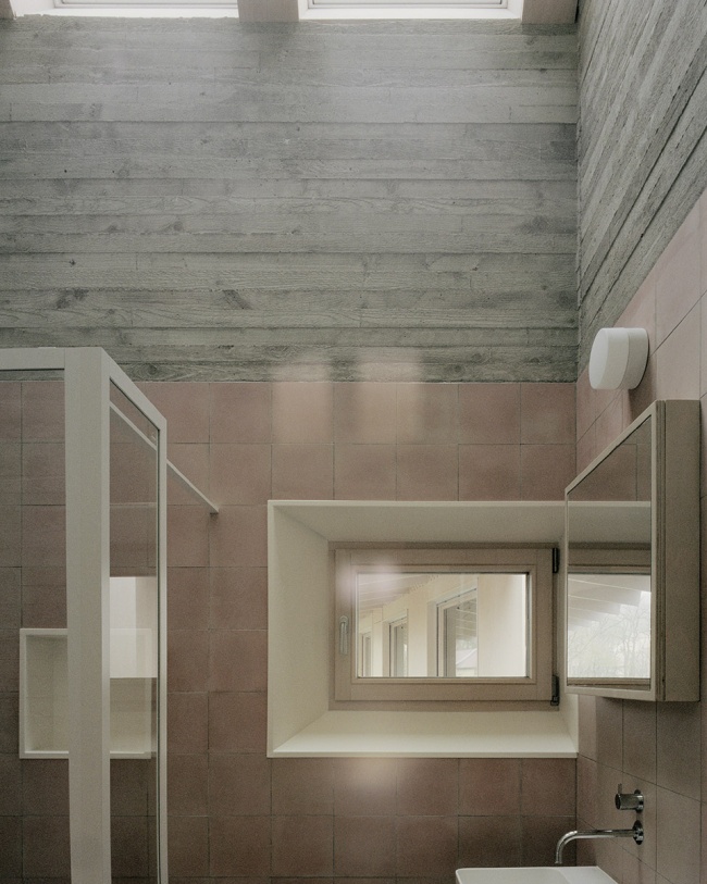 A commitment to material continuity shaped the project from the beginning. Large stones salvaged from the old house were incorporated into new rammed-concrete walls, executed with a custom mix of concrete and basalt aggregate from a nearby quarry. The same basalt reappears in the handcrafted terrazzo floors, tying the project’s surfaces back to the geology of the region.