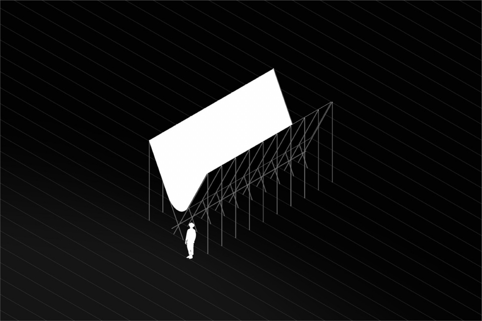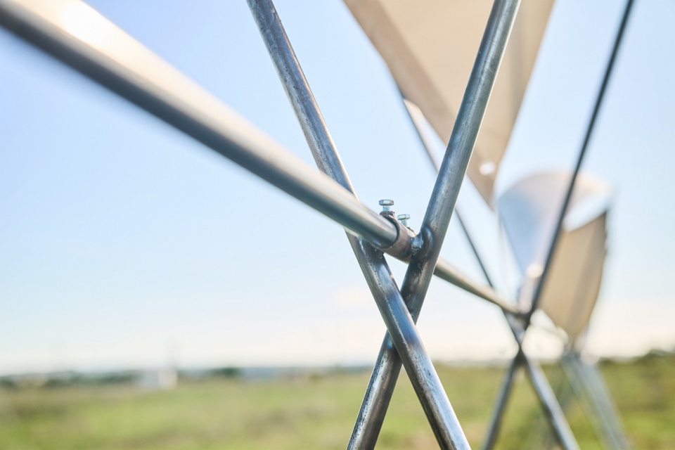 这座4.5米高的展馆采用地下锚固系统,主要由大截面圆形金属管构成,并由一个轻盈、半透明的开放式结构屋顶连接,该屋顶的几何形状基于悬链线。展馆整体采用模块化设计,由十个M形支撑单元组成,这些单元固定在地面锚固件上,顶部通过金属角钢连接边缘并支撑屋顶。为确保展馆的完整性,一个圆形截面水平延伸,支撑所有构件。