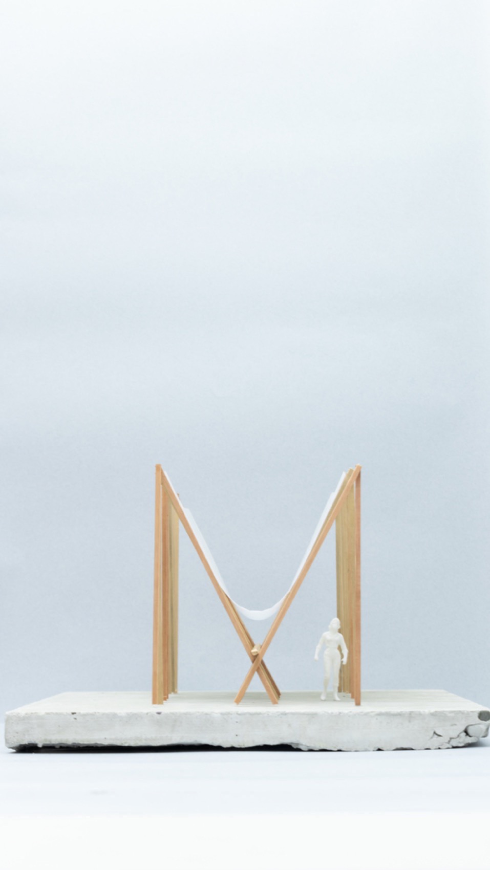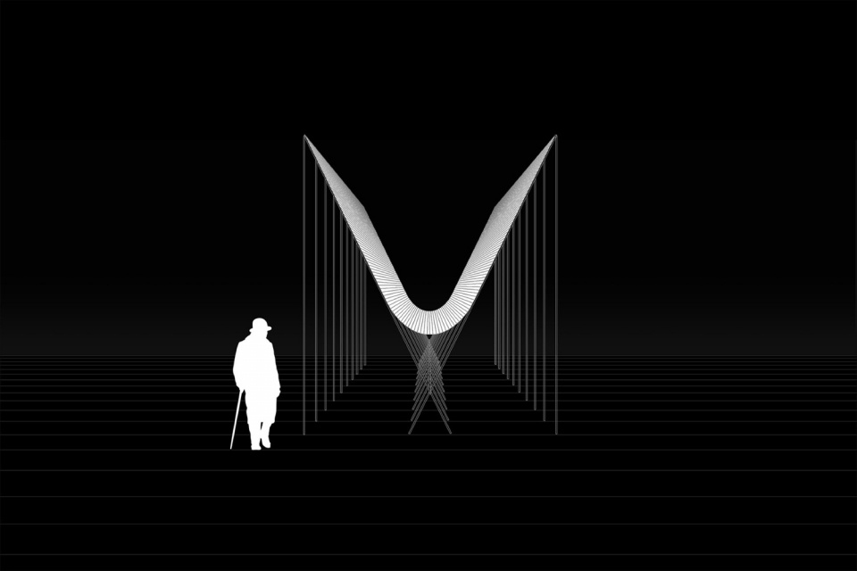 The catenary is a free-form geometric form, difficult to express and mathematically complex in its description. Horizon Pavilion is described as a catenary supported in a void, whose inverse geometry and compression in the center generate an opening, resulting in two parallel habitable spaces that form the path for visitors. The pavilion emphasizes its geometric lightness, seeking to inhabit the concavity and the lower spaces that define it. It is a symbolic threshold that extends to the horizon, an artifact that rises between the hills, the city, and the river.