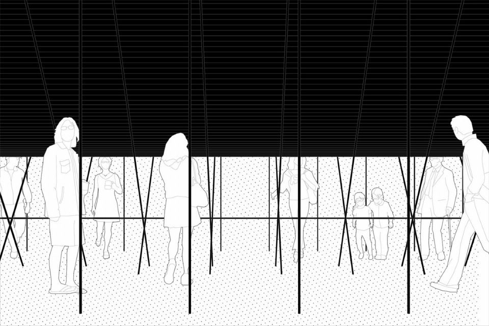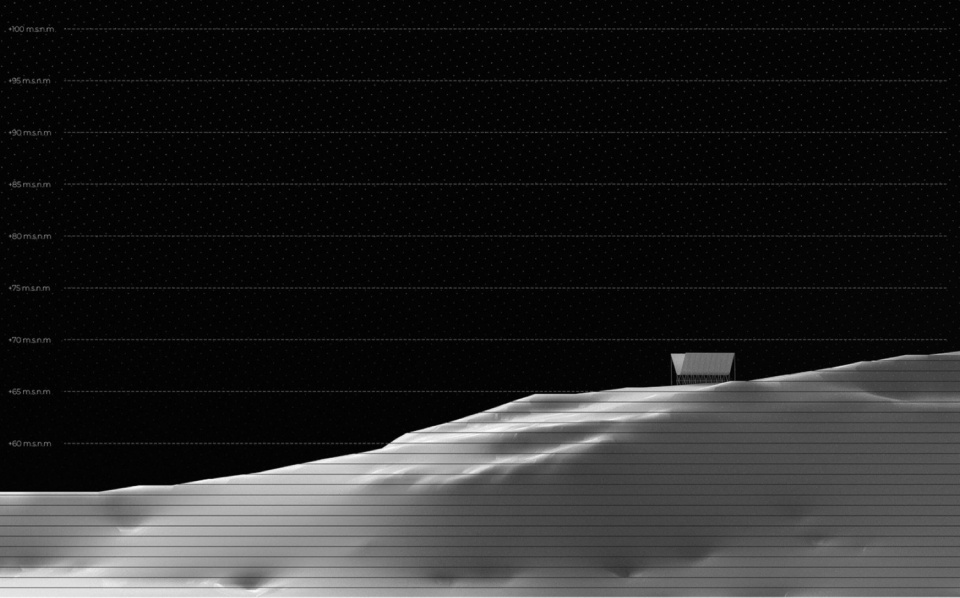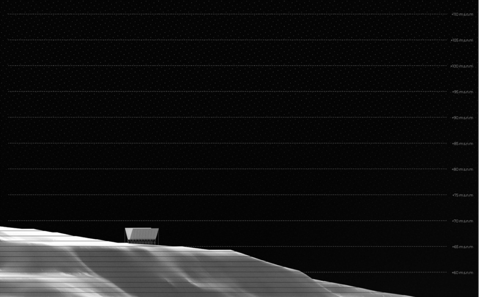 悬链线是一种自由的几何形式,难以表达,其描述也颇具数学复杂性。地平线展馆被描述为一条支撑于虚空中的悬链线,其反向几何形状和中心压缩形成了一个开口,从而创造出两个平行的可居住空间,构成了游客的游览路径。展馆强调其几何上的轻盈感,力求栖居于构成其轮廓的凹陷处和较低的空间。它是一个延伸至地平线的象征性门槛,一座在山丘、城市和河流之间拔地而起的人造物。