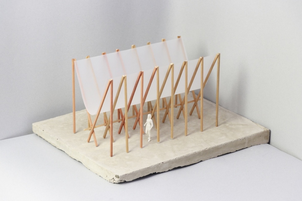 轻盈漂浮的纺织屋顶则赋予了建筑第二层含义:遮荫和营造氛围。门廊间延展的织物营造出光影交错的景象,唤起人们对耕作节奏、季节性保护以及土地日常照料的联想。它并非功能性的屋顶,而是一个象征性的建筑:它象征着劳动、庇护以及农业景观悠长而舒缓的韵律。