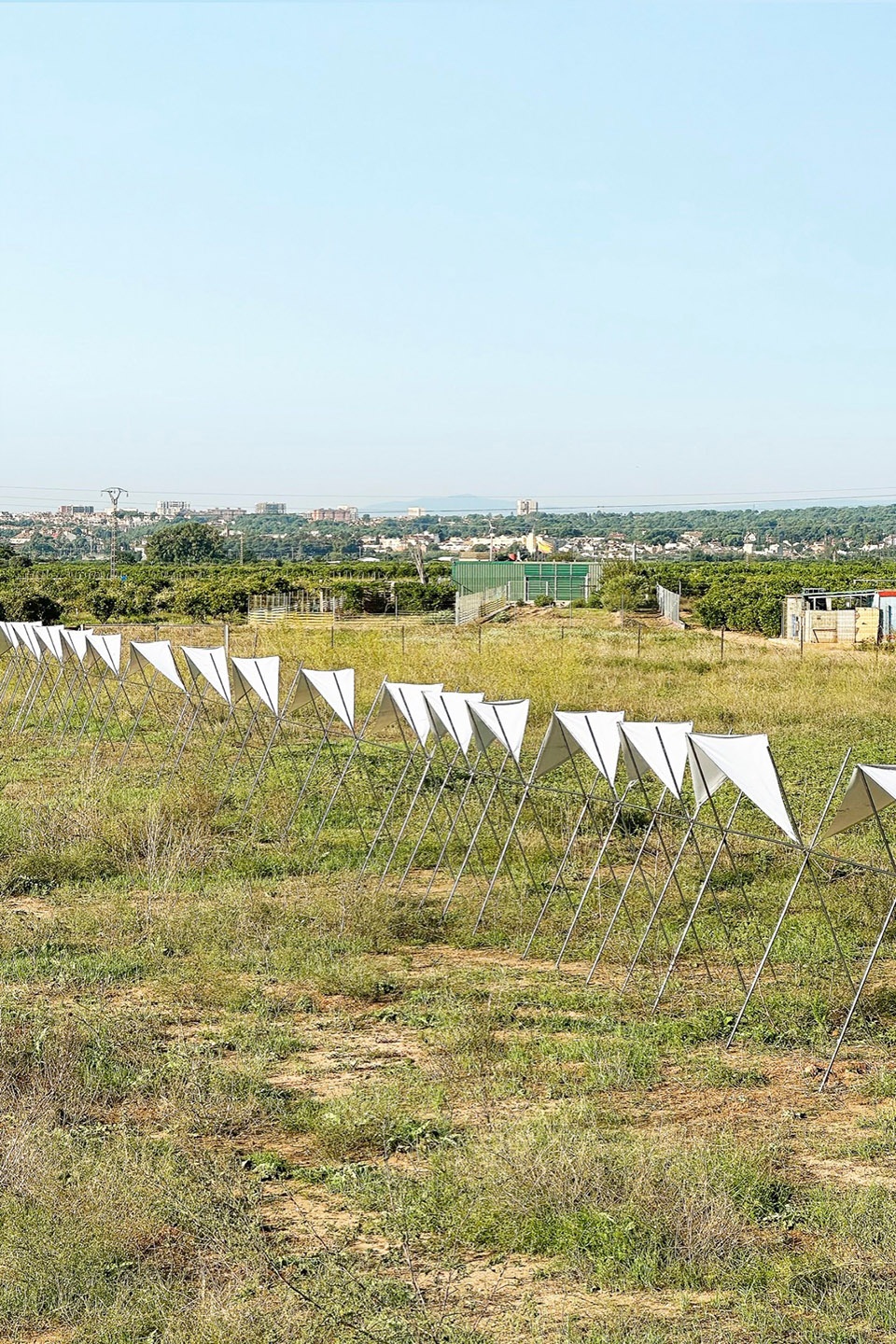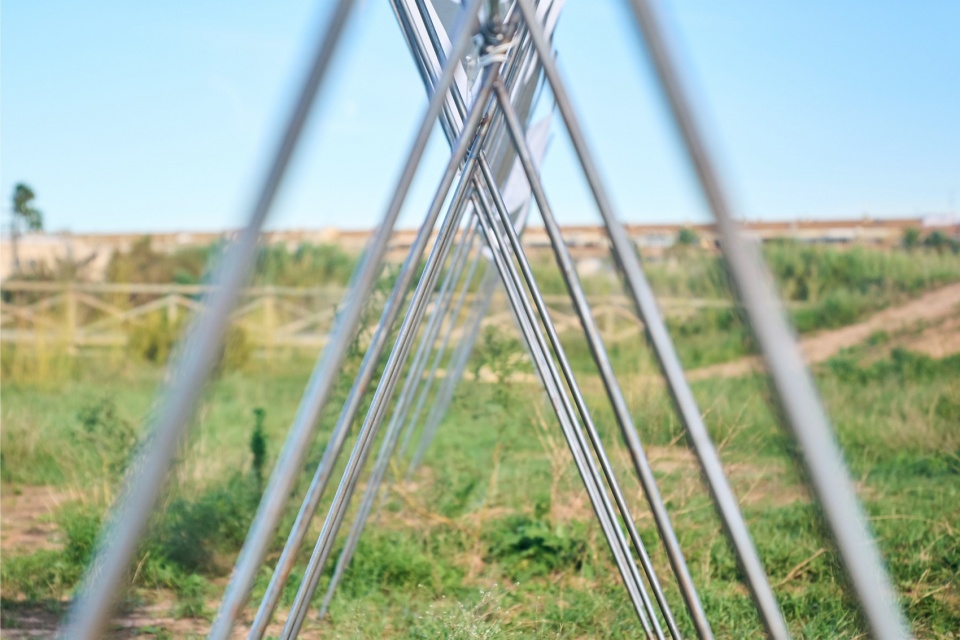 The 100 Linear Meters Pavilion is inserted into the Valencian orchard landscape as a subtle and evocative line, constructed from the rhythmic repetition of a reinterpreted portico. This structure, inspired by the traditional wooden trellises that have supported tomato cultivation in the region for generations, adapts to the present through the use of corrugated steel bars: a contemporary, recyclable, and reversible material that maintains the lightness and structural integrity of the original.