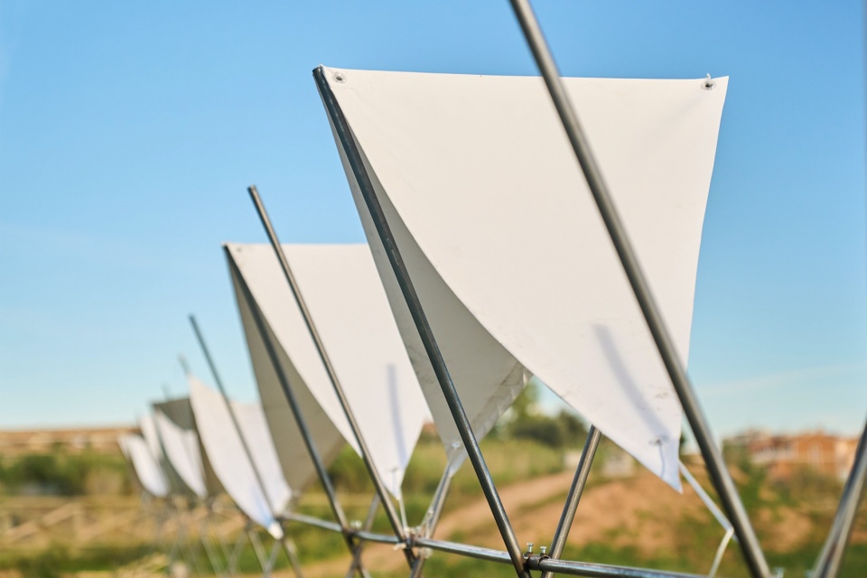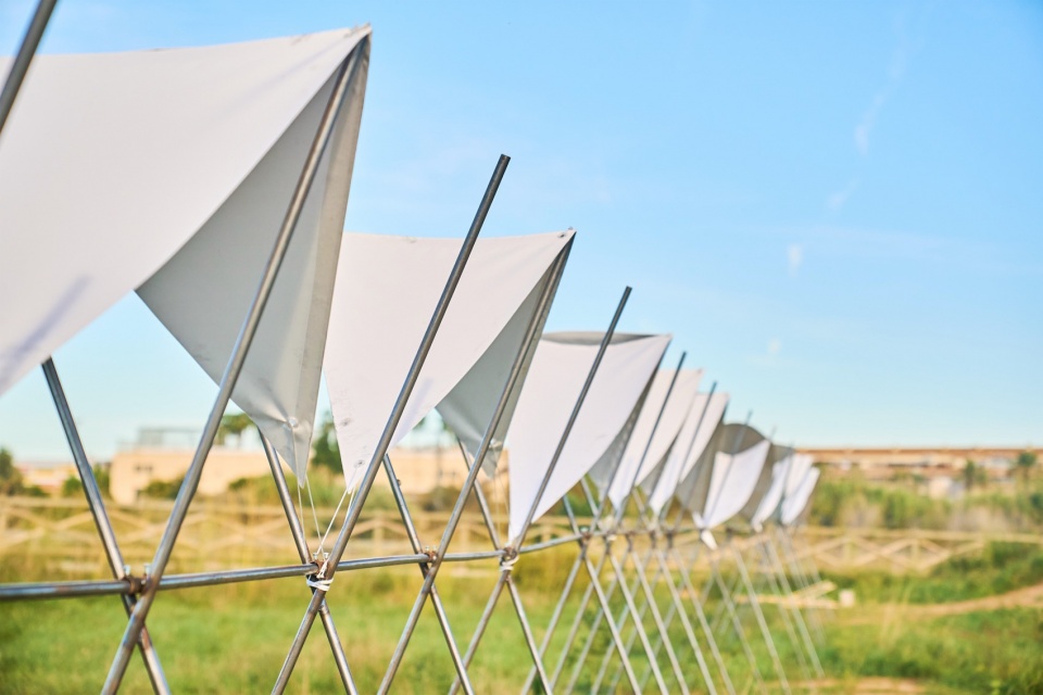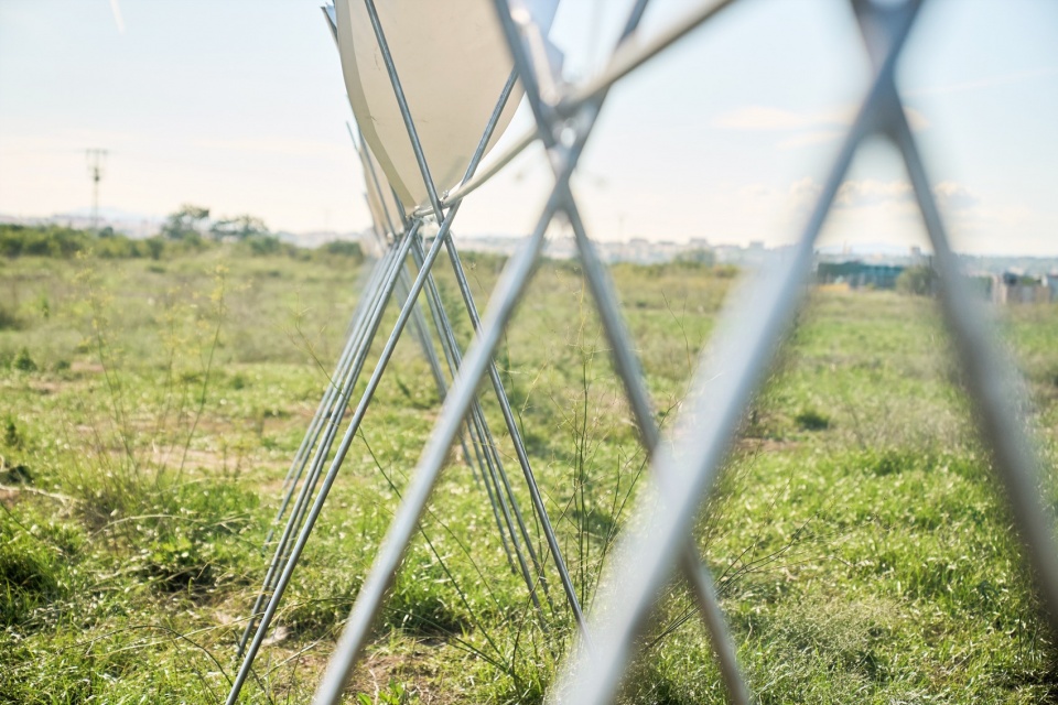 The 4.5-meter-high pavilion is organized using underground anchoring systems and constructed primarily of large-section circular metal tubes, joined by a lightweight, translucent, open-structure roof whose geometry is based on a catenary. The overall configuration of the pavilion is a modular design composed of ten M-shaped support units, fixed to ground anchors and metal angles at the top to join the edges and maintain the roof. To ensure the integrity of the pavilion, a circular profile extends horizontally, supporting all the elements.